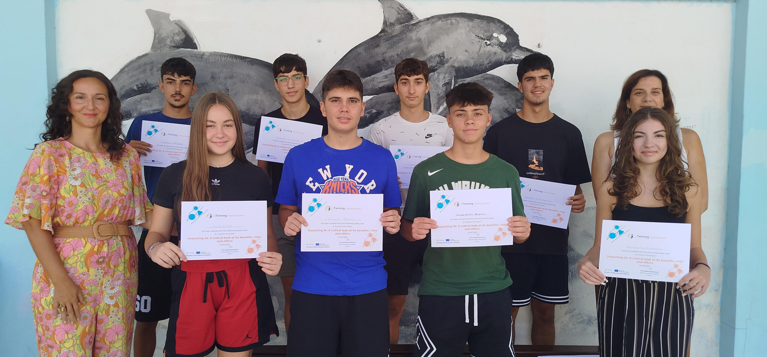 Στο πλαίσιο του ίδιου Ομίλου και της Καινοτόμου Δράσης “Καλλιεργώντας τον γραμματισμό Τεχνητής Νοημοσύνης (ΤΝ) στο μάθημα ξένης γλώσσας στο Λύκειο” υλοποιήθηκε και το ευρωπαϊκό πρόγραμμα eTwinning με τίτλο “Unpacking AI: A critical look at its benefits, risks and ethics”, το οποίο βραβεύτηκε με την Εθνική Ετικέτα Ποιότητας eTwinning. Υπεύθυνες εκπαιδευτικοί του προγράμματος ήταν η κ. Οικονόμου Ευαγγελία (Αγγλικής Φιλολογίας) και η κ. Φωτεινοπούλου Βασιλική (Γερμανικής Φιλολογίας).