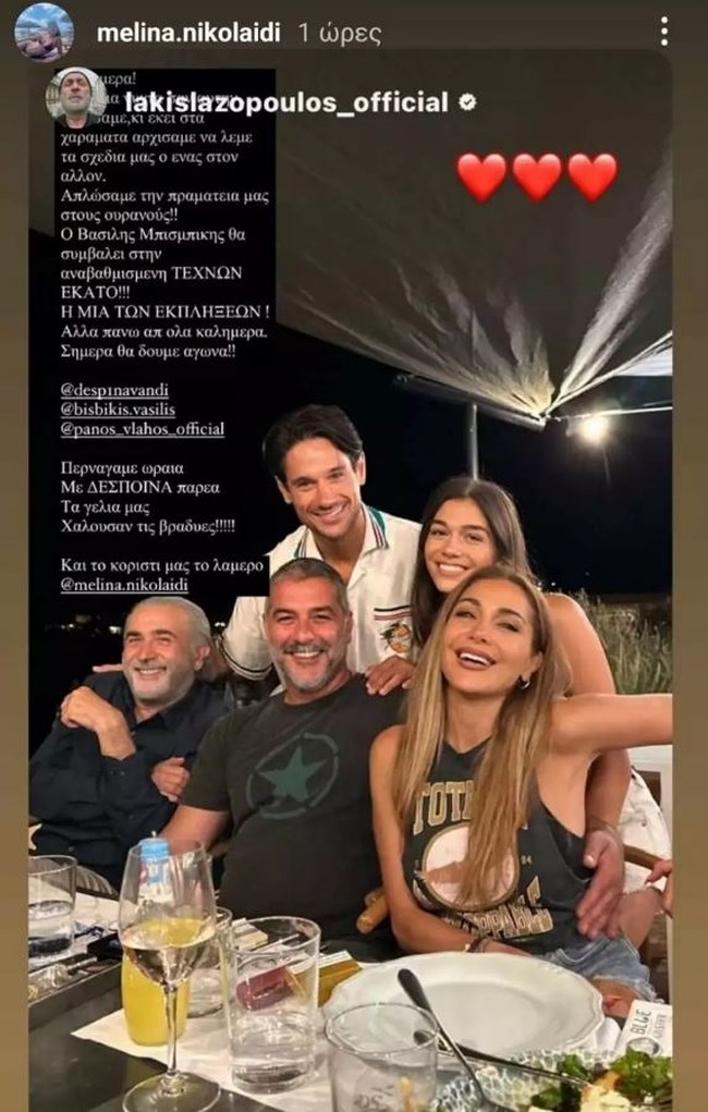 “Καλημέρα! Μετά μια νύχτα σαν κι αυτήν. Γελάσαμε και εκεί στα χαράματα αρχίσαμε να λέμε τα σχέδια μας ο ένας στον άλλον. Απλώσαμε την πραμάτεια μας στους ουρανούς. Ο Βασίλης Μπισμπίκης θα συμβάλει στην αναβαθμισμένη ΤΕΧΝΩΝ ΕΚΑΤΟ. Η μία των εκπλήξεων. Αλλά πάνω από όλα καλημέρα, σήμερα θα δούμε αγώνα. Περνάγαμε ωραία με Δέσποινα παρέα τα γέλια μας χαλούσαν τις βραδιές. Και το κορίτσι μας το λαμπερό, Μελίνα Νικολαΐδη”.