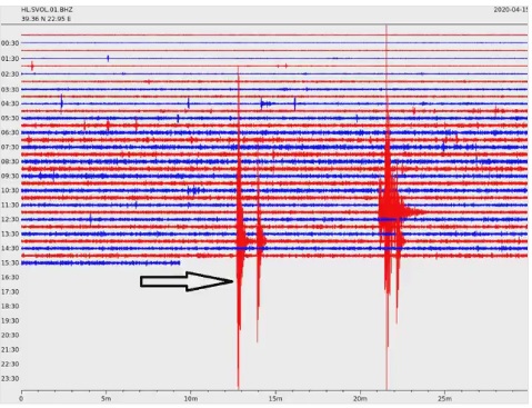 Τα σεισμόμετρα του δικτύου SNAC που συντονίζει ο Γεράσιμος Χουλιάρας (Γεωδυναμικό Ινστιτούτο, Εθνικό Αστεροσκοπείο Αθηνών) δεν σταματούν να καταγράφουν τις δονήσεις της γης. Στην παρακάτω εικόνα φαίνεται ο σεισμός όπως καταγράφηκε από τον σεισμογράφο του Βόλου.
