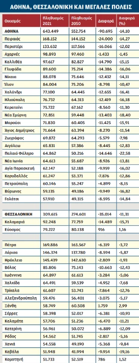 Περίπου 12.000 θα είναι το 2050 τα χωριά κάτω των 1.500 κατοίκων που πρόσφατα ανακοινώθηκε ότι θα ενισχυθούν με μέτρα όπως η μείωση του ΕΝΦΙΑ. Από αυτά σχεδόν 8.000 χωριά θα «ξεμείνουν» με πληθυσμό ηλικιωμένων κάτω των 100 κατοίκων. Πρόκειται δηλαδή για χωριά-φαντάσματα που με δυσκολία θα διαθέτουν έστω ένα μικρό καφενείο. Συγχρόνως, περίπου 1.200 μικρά χωριά της επαρχίας εξαφανίζονται εντελώς από τον χάρτη. Τέλος, θα υπάρχουν 15 μεγάλες πόλεις άνω των 50.000 κατοίκων εκτός της Αττικής και της Θεσσαλονίκης, που επίσης δέχονται δημογραφικές πιέσεις.