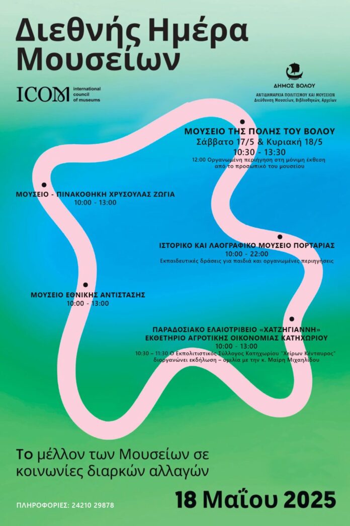 Με αφορμή τη Διεθνή Ημέρα Μουσείων, την Κυριακή 18 Μαΐου, η Διεύθυνση Αρχείων Μουσείων Βιβλιοθηκών της Αντιδημαρχίας Πολιτισμού και Μουσείων Δήμου Βόλου διοργανώνει εκδηλώσεις και δωρεάν ξεναγήσεις στα μουσεία της αρμοδιότητάς της.