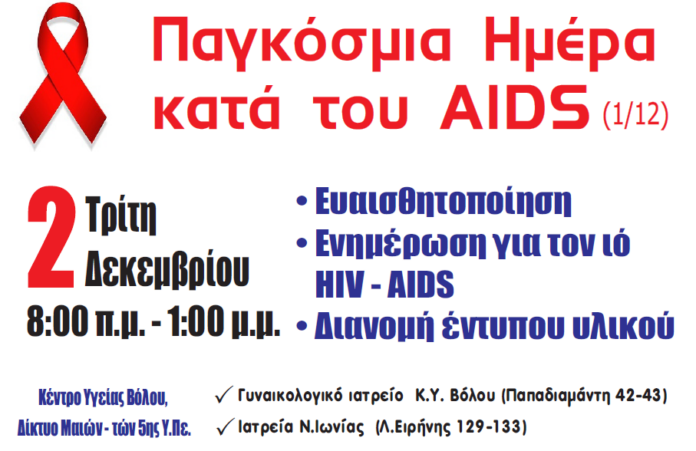 Σε μια ακόμη δράση ενημέρωσης αυτή τη φορά για την Παγκόσμια Ημέρα κατά του AIDS, προχωρούν οι μαίες του Κέντρου Υγείας Βόλου την Τρίτη 2 Δεκεμβρίου από τις 8 το πρωί ως τη 1 το μεσημέρι στο γυναικολογικό ιατρείο του Κέντρου Υγείας Βόλου στην οδό Παπαδιαμάντη 42-43 και στα Ιατρεία της Ν. Ιωνίας στην Λεωφόρο Ειρήνης 129-133.