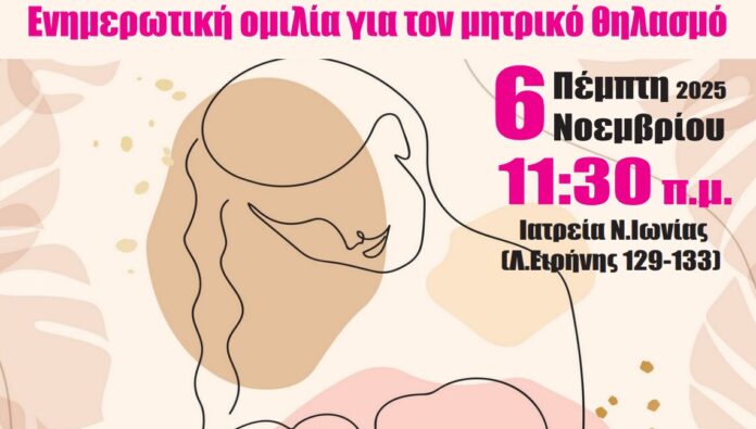 Με αφορμή τον εορτασμό της Παγκόσμιας Εβδομάδας Μητρικού Θηλασμού στη χώρα μας ( 1-7 Νοεμβρίου ) θα πραγματοποιηθεί δράση ενημέρωσης για την διατροφική αξία του μητρικού γάλακτος και τα ευεργετικά οφέλη του για κάθε μητέρα και το παιδί της από τις μαίες του Κέντρου Υγείας Βόλου την Πέμπτη 6 Νοεμβρίου και ώρα 11.30π.μ. στα Ιατρεία Ν. Ιωνίας ( Λ.Ειρήνης 129-133).