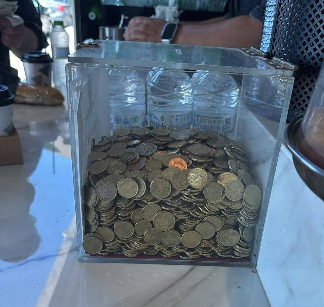 Γέμισε ο κουμπαράς του καταστήματος του Χρυσοβαλάντη Ντόντου στο Βελεστίνο από κέρματα που ρίχνουν πελάτες με σκοπό να ενισχύσουν την προσπάθεια στήριξης άπορων οικογενειών του «Εσταυρωμένου».