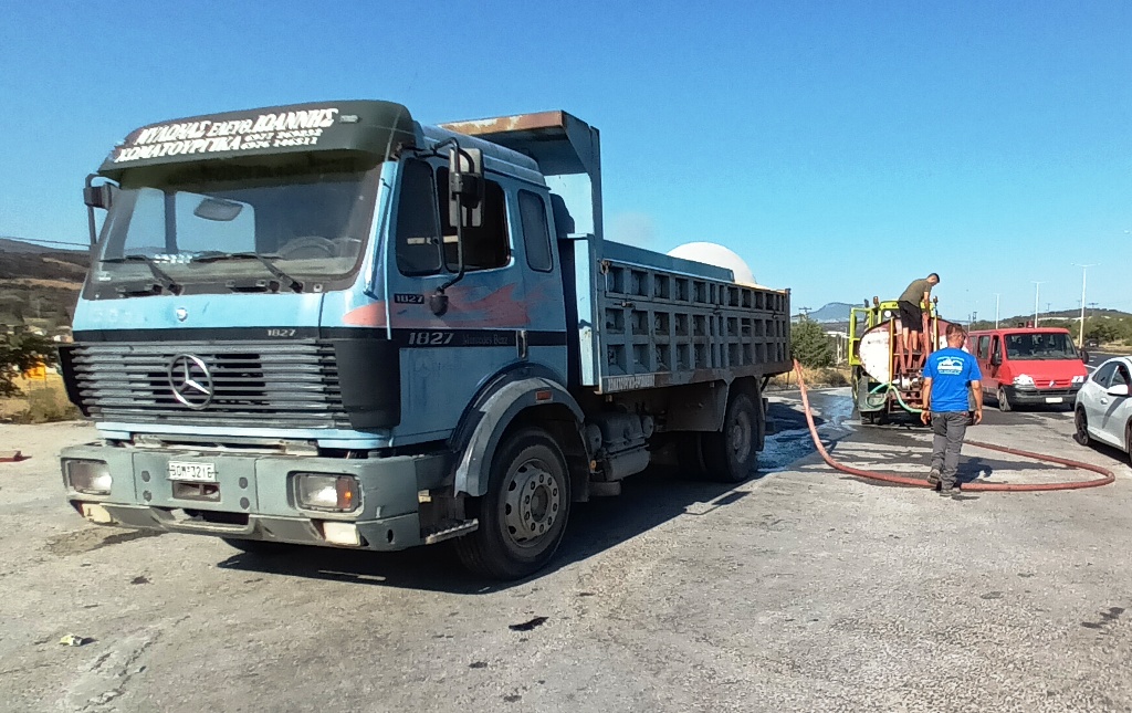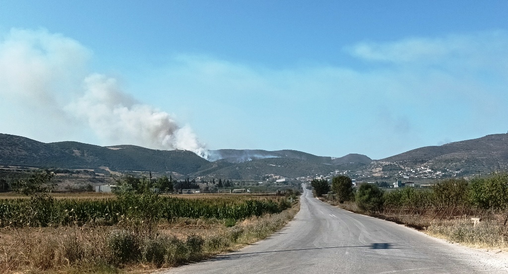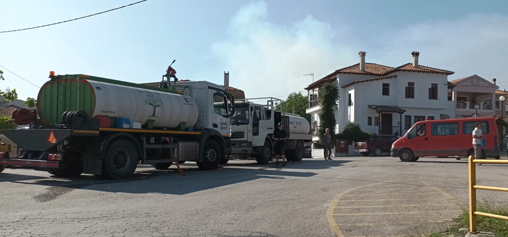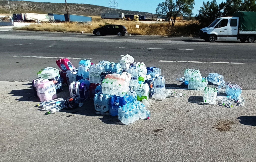 Στο ύψος της διασταύρωσης προς Σέσκλο, διακρίνονται πυροσβεστικά οχήματα, περιπολικά και υδροφόρες με νερό της Περιφέρειας, για να ανεφοδιάζονται τα οχήματα της Πυροσβεστικής, καθώς η περιοχή δεν έχει νερό. Στο σημείο βρίσκονται ακόμη πολλά μπουκάλια με νερό για τις δυνάμεις πυρόσβεσης, που πήγαν από χθες εθελοντές και εξακολουθούν να πηγαίνουν μέχρι αυτή την ώρα.