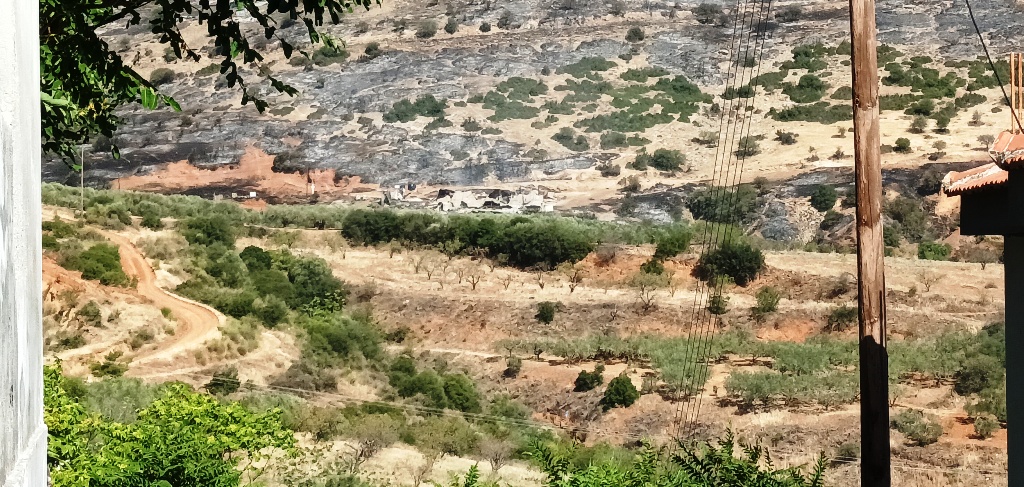 Στις δύο πλευρές του δρόμου διακρίνονται καμένα ακόμη και στην νησίδα του δρόμου προς Βελεστίνο – σε ορισμένα σημεία έβγαινε ακόμη καπνός και στύλοι της ΔΕΗ καιγόταν ακόμη – ενώ στις δύο Βιομηχανικές Περιοχές που κινδύνεψαν, η κατάσταση καλή, χωρίς ευτυχώς η φωτιά να έφτασε σε κάποια βιομηχανική μονάδα.