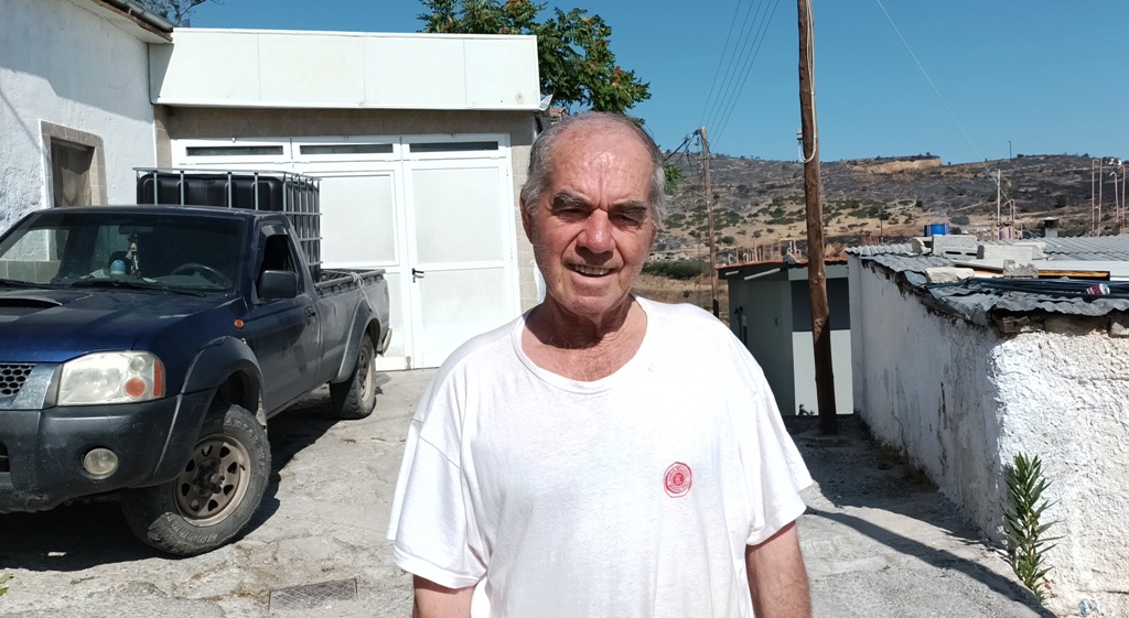 Όπως είπε, η φωτιά έσπασε στο σπίτι του και στο τυροκομείο στις παρυφές του χωριού και ο ίδιος που διαθέτει αγροτικό αυτοκίνητο με δεξαμενή νερού με τους πυροσβέστες έδωσαν «μάχη» για να μην κάψουν οι φλόγες την περιουσία του, καθώς από τον αέρα θέριευαν πολύ.