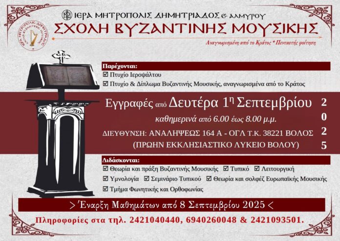 Ξεκίνησαν και συνεχίζονται οι εγγραφές στο Τμήμα Φωνητικής και Ορθοφωνίας της Σχολής Βυζ. Μουσικής της Ιεράς Μητροπόλεως Δημητριάδος, το οποίο συνεχίζει την λειτουργία του, με ιδιαίτερη επιτυχία, για ακόμα μία χρονιά. Υπεύθυνος καθηγητής του Τμήματος είναι ο διακεκριμένος Μουσικός κ. Νικόλαος Παρθένης, Φιλόλογος. Οι εγγραφές πραγματοποιούνται κάθε Δευτέρα και Πέμπτη, 5-8μ.μ., στην Σχολή (πρ. εκκλησιαστικό Λύκειο, όπισθεν Ναού της Αναλήψεως στον Βόλο). Η φοίτηση είναι μονοετής και τα μαθήματα ξεκινούν την Τρίτη 7 Οκτωβρίου.