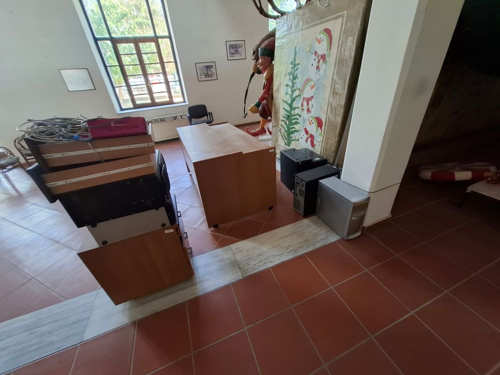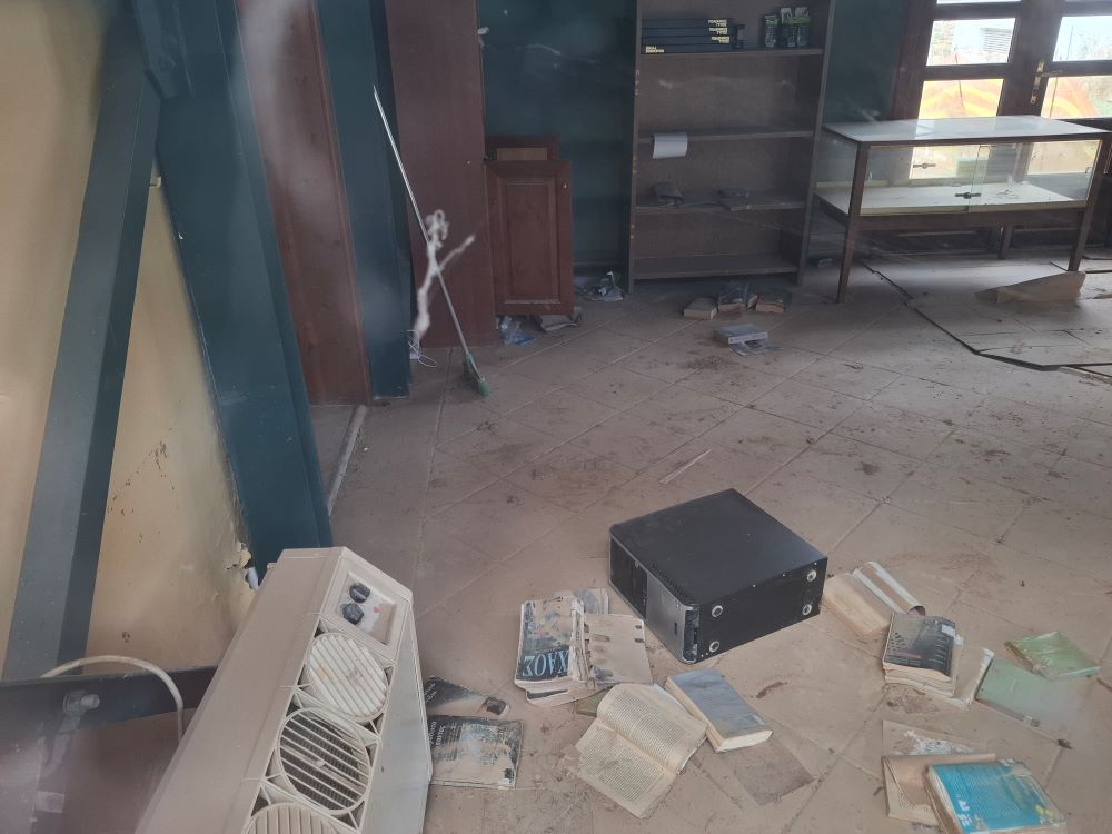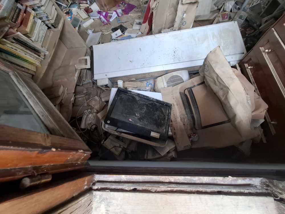 Παράλληλα μαζί με τα βιβλία, εντοπίζονται πεταμένα χαρτόκουτα, σκουπίδια, μέχρι οθόνη ηλεκτρονικού υπολογιστή, ένα αερόθερμο και καλοριφέρ. Σε ένα άλλο δωμάτιο η κατάσταση μπορεί να μην είναι ίδια με την παραπάνω, αλλά το χώμα παραμένει και λίγα βιβλία έχουν πεταχτεί, ωστόσο, το κουτί ενός υπολογιστή για τον οποίο δαπανήθηκαν προφανώς χρήματα ώστε να αγοραστεί, είναι πεταμένος κάτω…