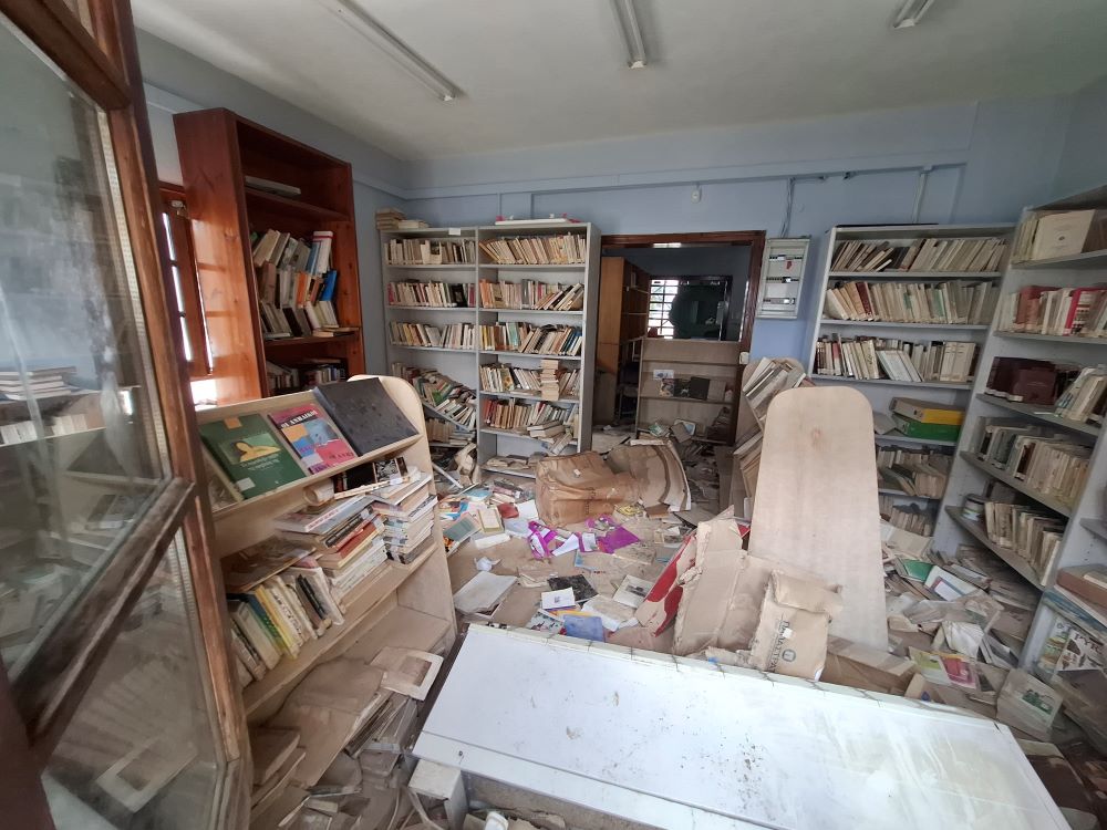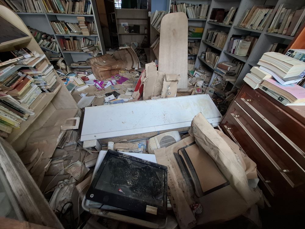 Το πάτωμα εκτός από δέκα… δάχτυλα σκόνη, που προφανώς προήλθε από τη λάσπη εξαιτίας των περσινών πλημμυρών, είναι γεμάτο με βιβλία τα οποία αντί να χρησιμοποιούνται για τον σκοπό που πρέπει, έχουν καταστραφεί, ευρισκόμενα σκισμένα και μέσα στη σκόνη.