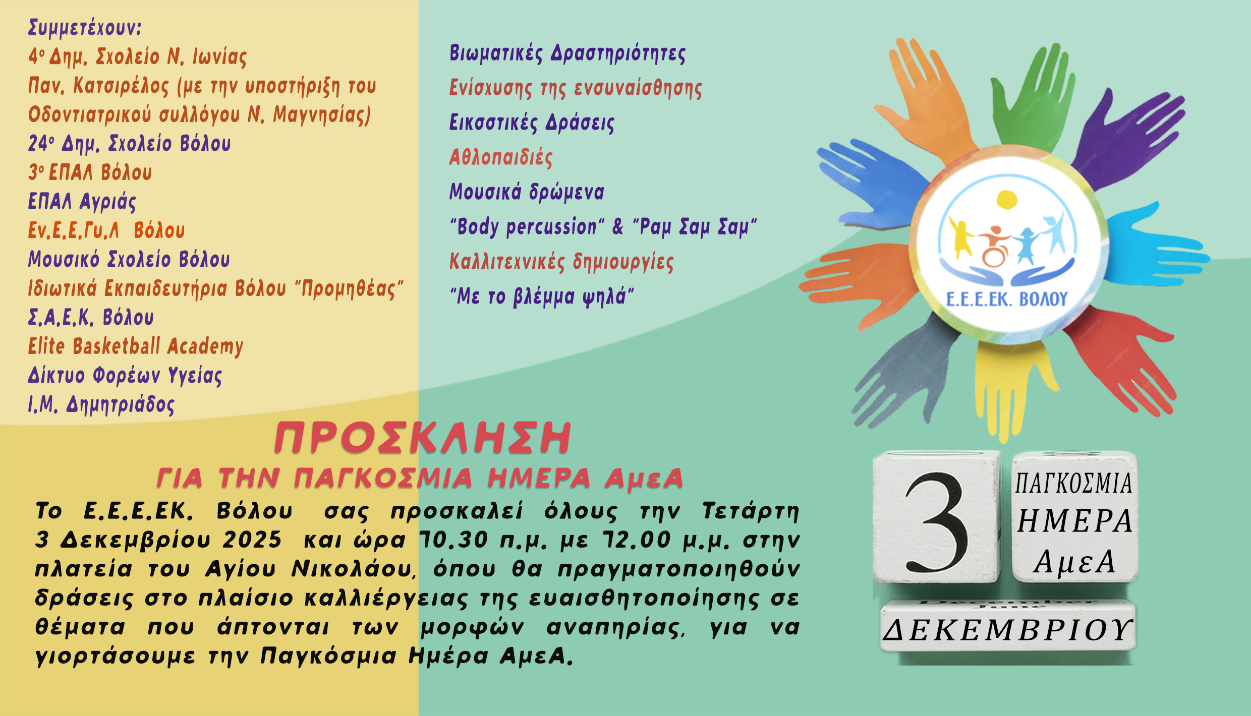 Εκδηλώσεις με αφορμή την Παγκόσμια Ημέρα Ατόμων με Αναπηρία διοργανώνει αύριο Τετάρτη 3 Δεκεμβρίου το ΕΕΕΕΚ Βόλου σε συνεργασία με το Άτυπο Δίκτυο Φορέων Υγείας της Ιεράς Μητρόπολης Δημητριάδος.