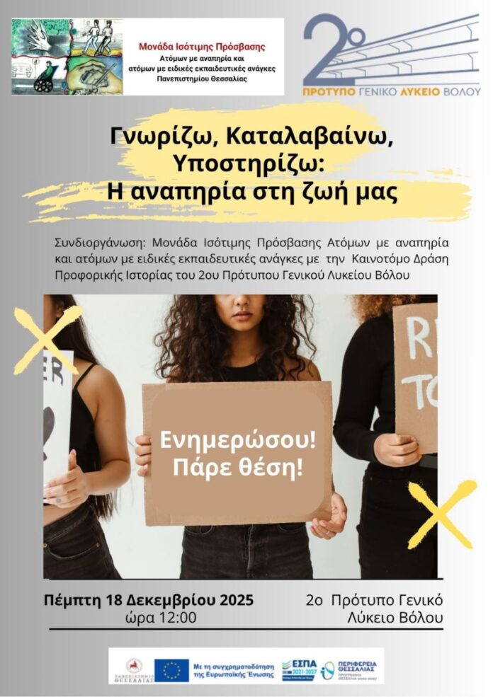 Εκδήλωση ευαισθητοποίησης στο πλαίσιο της Παγκόσμιας Ημέρας για την Αναπηρία (3 Δεκεμβρίου) διοργανώνει το 2ο Πρότυπο Λύκειο Βόλου, αύριο Πέμπτη 18/12 από τις 12.15 έως και τις 13.45.