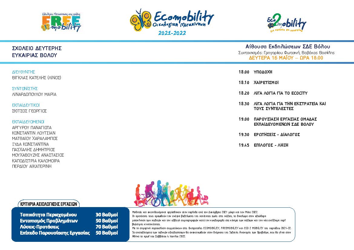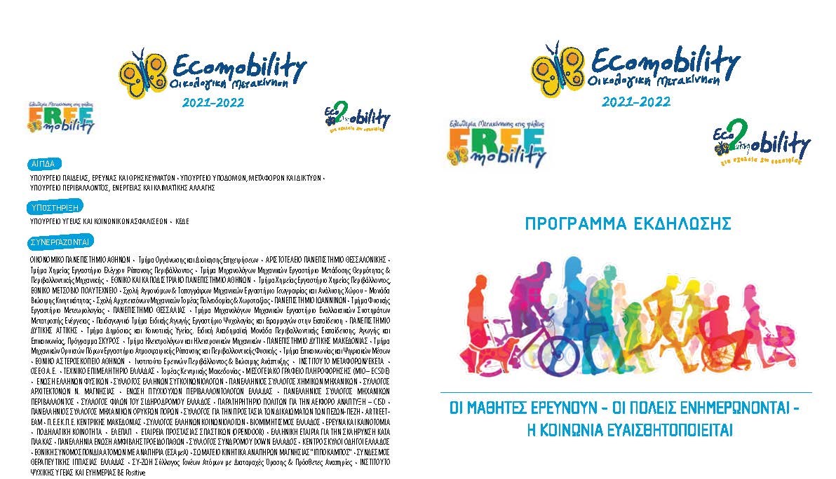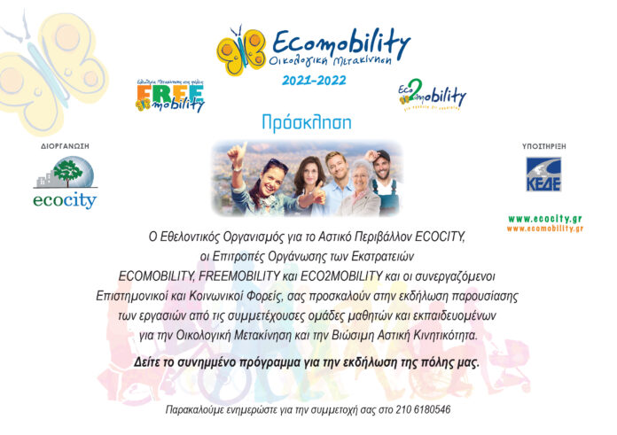 Ο Εθελοντικός Οργανισμός για το Αστικό Περιβάλλον ECOCITY, οι επιτροπές οργάνωσης των εκστρατειών ECOMOBILITY, FREEMOBILITY, και ECO2MOBILITY και οι Συνεργαζόμενοι Επιστημονικοί και Κοινωνικοί Φορείς μας προσκαλούν στην εκδήλωση παρουσίασης των εργασιών από τις συμμετέχουσες ομάδες μαθητών και εκπαιδευομένων του Σχολείου Δεύτερης Ευκαιρίας για την Οικολογική Μετακίνηση και τη Βιώσιμη Αστική Κινητικότητα, τη Δευτέρα 16 Μαΐου στις 18.00 στην αίθουσα εκδηλώσεων του σχολείου. Η εκδήλωση θα πραγματοποιηθεί υπό την αιγίδα του Υπουργείου Παιδείας Έρευνας και Θρησκευμάτων, του Υπουργείου Υποδομών Μεταφορών και Δικτύων, Περιβάλλοντος Ενέργειας και Κλιματικής Αλλαγής.