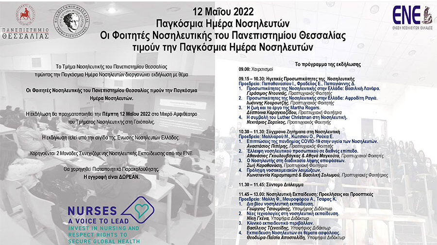 Οι φοιτητές του Τμήματος Νοσηλευτικής του Πανεπιστημίου Θεσσαλίας τιμώντας την Παγκόσμια Ημέρα Νοσηλευτών διοργανώνουν εκδήλωση, η οποία θα πραγματοποιηθεί την Πέμπτη 12 Μαΐου 2022 και ώρες 09.00-13.00 στο Μικρό Αμφιθέατρο του Τμήματος στη Γαιόπολις. Η εκδήλωση τελεί υπό την αιγίδα της Ένωσης Νοσηλευτών Ελλάδος.