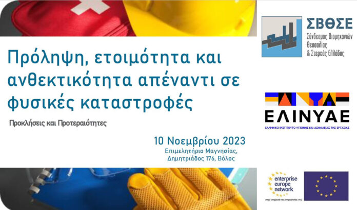 Πολύ σημαντικές προσωπικότητες αναμένεται να δώσουν το παρών στην ιδιαίτερα επίκαιρη εκδήλωση, με τίτλο «Πρόληψη, ετοιμότητα και ανθεκτικότητα απέναντι σε φυσικές καταστροφές- Προκλήσεις και Πρoτεραιότητες» που διοργανώνει ο Σύνδεσμος Βιομηχανιών Θεσσαλίας & Στερεάς Ελλάδος ΣΒΘΣΕ, σε συνεργασία με το Ελληνικό Ινστιτούτο Υγιεινής & Ασφάλειας στην Εργασία ΕΛΙΝΥΑΕ σήμερα Παρασκευή 10.11.2023 και ώρα 17.00-20.30, στην αίθουσα του Επιμελητηρίου Μαγνησίας στον Βόλο.