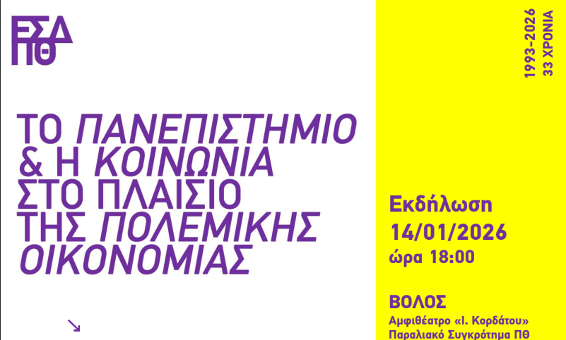 Ο Ενιαίος Σύλλογος Διδασκόντων Πανεπιστημίου Θεσσαλίας διοργανώνει την Τετάρτη 14 Ιανουαρίου στις 18:00 εκδήλωση με θέμα το πανεπιστήμιο και η κοινωνία στο πλαίσιο της Πολεμικής Οικονομίας στο Αμφιθέατρο «Ι. Κορδάτος», στο Παραλιακό συγκρότημα του Πανεπιστημίου Θεσσαλίας στον Βόλο.