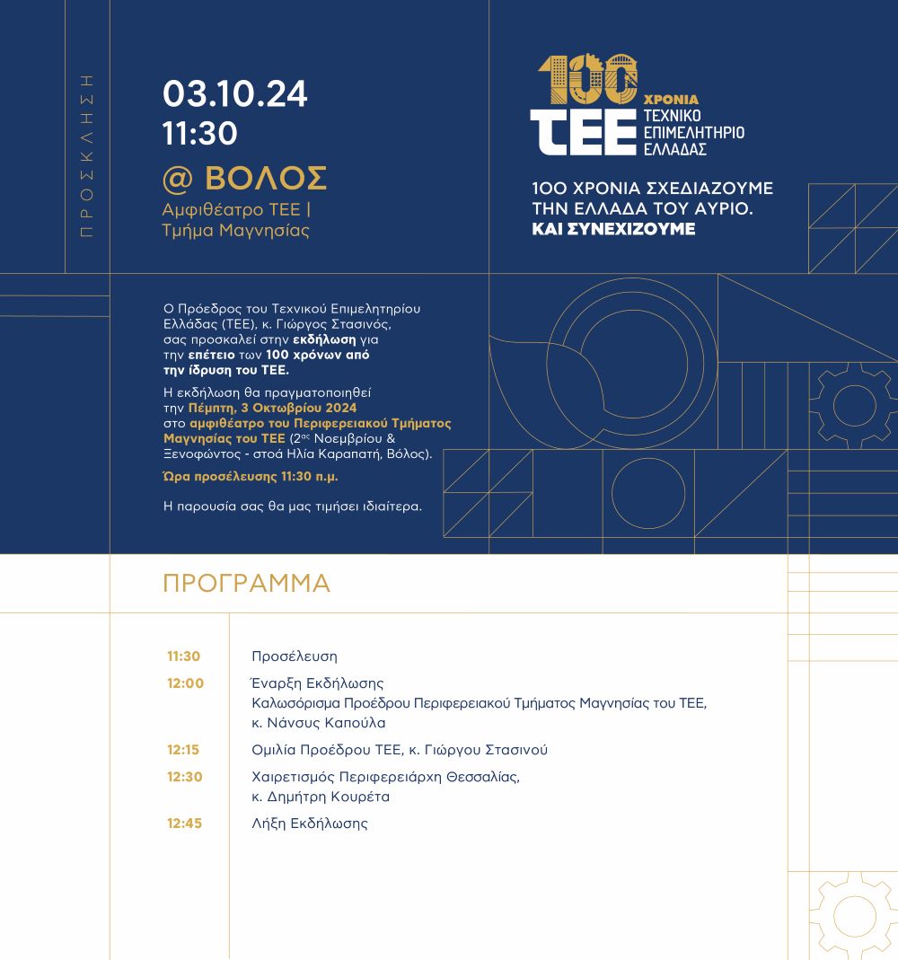 Εκδήλωση για την επέτειο των 100 χρόνων από την ίδρυση του ΤΕΕ, θα πραγματοποιηθεί την Πέμπτη, 3 Οκτωβρίου, στο αμφιθέατρο του Περιφερειακού Τμήματος Μαγνησίας του ΤΕΕ (2ας Νοεμβρίου & Ξενοφώντος – στοά Ηλία Καραπατή, Βόλος).