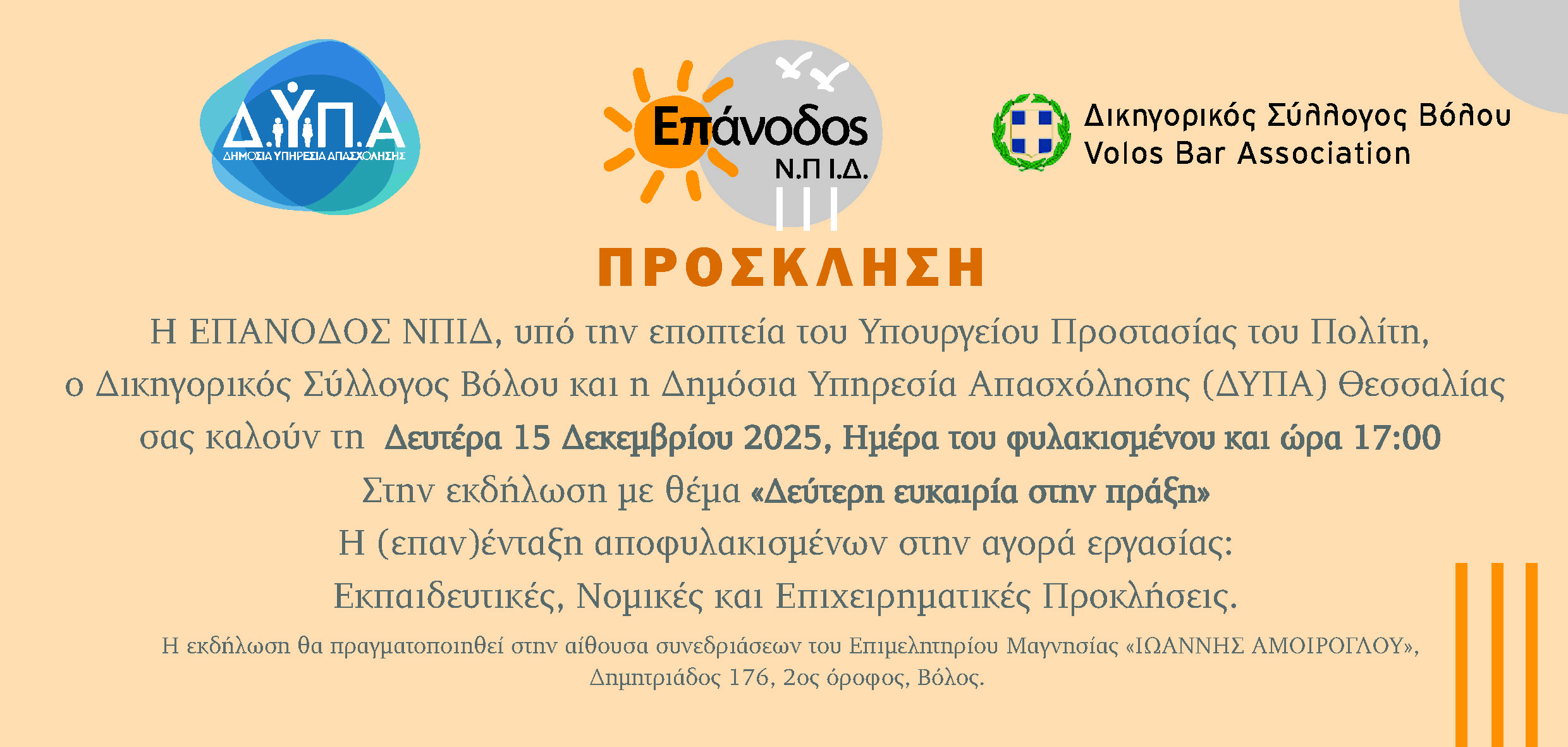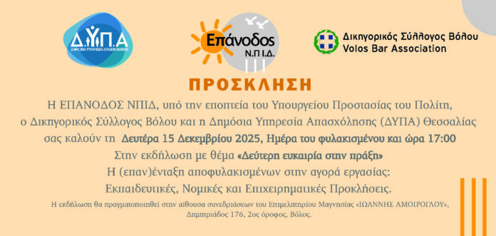 Η ΕΠΑΝΟΔΟΣ ΝΠΙΔ, υπό την εποπτεία του Υπουργείου Προστασίας του Πολίτη, ο Δικηγορικός Σύλλογος Βόλου και η Δημόσια Υπηρεσία Απασχόλησης (ΔΥΠΑ) Θεσσαλίας πραγματοποιούν τη Δευτέρα 15 Δεκεμβρίου, Ημέρα του φυλακισμένου και ώρα 17:00 εκδήλωση με θέμα «Δεύτερη ευκαιρία στην πράξη- Η (επαν)ένταξη αποφυλακισμένων στην αγορά εργασίας: Εκπαιδευτικές, νομικές και επιχειρηματικές προκλήσεις».