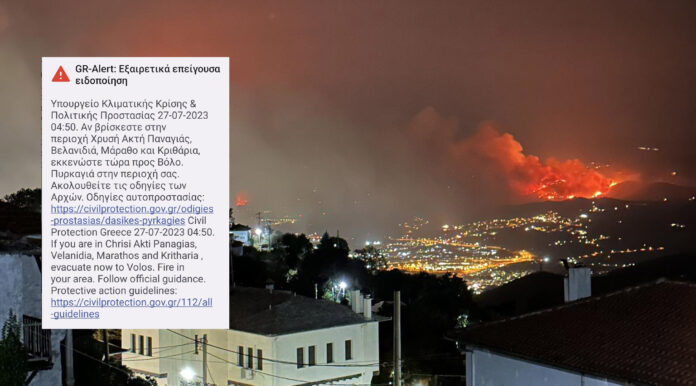 Την εκκένωση των οικισμών του Δήμου Βόλου ζήτησε με νέο μήνυμα στα κινητά των Βολιωτών το Υπουργείο Κλιματικής Κρίσης και Πολιτικής Προστασίας. Συγκεκριμένα το μήνυμα εστάλη στις 4.50 τα ξημερώματα της Παρασκευής και ενημερώνει για την εκκένωση των οικισμών Χρυσής Ακτής Παναγιάς, Μ.Βελανιδιάς, Μαράθου και Κριθαριάς λόγω απειλής από τις φλόγες που έχουν πλέον περικυκλώσει την πόλη.