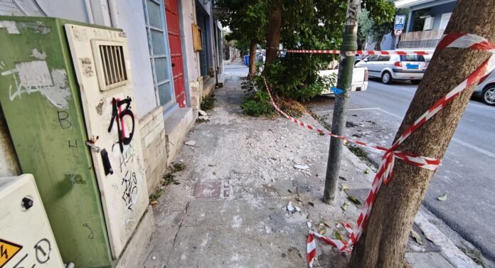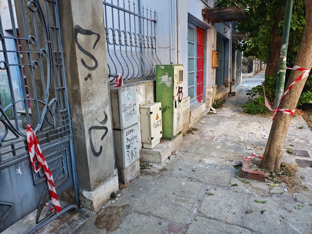 Κομμένη είναι η ταινία σήμανσης που τοποθετήθηκε σε σημείο της οδού Ανθίμου Γαζή, κοντά στη Ροζού, γύρω από ιδιωτικό κτήριο απ’ όπου την περασμένη εβδομάδα αποκολλήθηκε και έπεσε στο πεζοδρόμιο ένα μικρό κομμάτι σοβά, χωρίς ευτυχώς να χτυπήσει κάποιος.