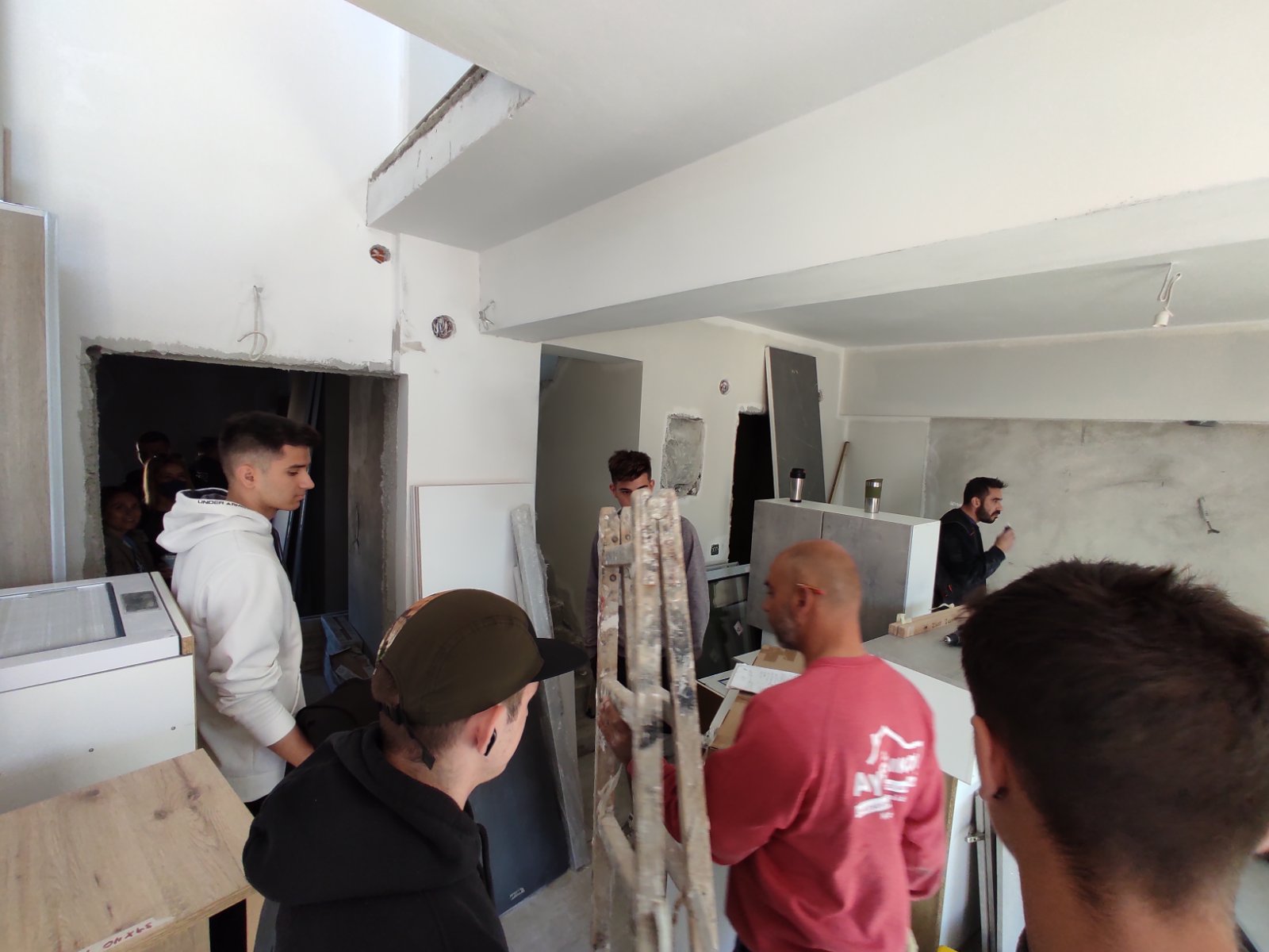 Στη συνέχεια επισκέφθηκαν τη νεοαναγειρόμενη τετραώροφη πολυκατοικία επί της οδού Παγασών, μελέτη των MAD architects, με παρουσίαση από τον εργολάβο κ.Π.Θάνο. Οι φάσεις των κατασκευών ήταν σε διαφορετικά στάδια και αυτό ήταν ιδιαίτερα χρήσιμο για τους μαθητές ώστε να δουν από κοντά τις πραγματικές συνθήκες εργασίας αλλά και το κτίριο ως ένα σύνολο με αλληλένδετες εργασίες διαφόρων συνεργείων.