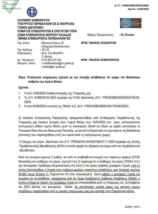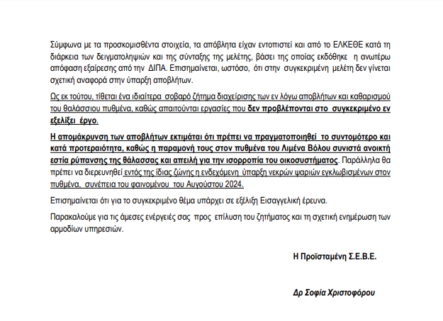 Σημειώνεται ότι το έγγραφο των Επιθεωρητών Περιβάλλοντος ανέφερε την ύπαρξη 50.000 τόνων αποβλήτων, που βρίσκονται στο λιμάνι μετά το «σπάσιμο» του ΧΑΔΑ στην πλημμύρα του Daniel. Μάλιστα οι Επιθεωρητές Περιβάλλοντος ζητούν να απομακρυθούν άμεσα τα εν λόγω απόβλητα καθώς συνιστούν ανοιχτή εστία ρύπανσης της θάλασσας και απειλή για την ισορροπία του οικοσυστήματος. Παράλληλα, όπως επισημαίνουν, πρέπει να διερευνηθεί εντός της ίδιας ζώνης, η ενδεχόμενη ύπαρξη νεκρών ψαριών εγκλωβισμένων στον πυθμένα, συνέπεια του φαινομένου του Αυγούστου 2024.