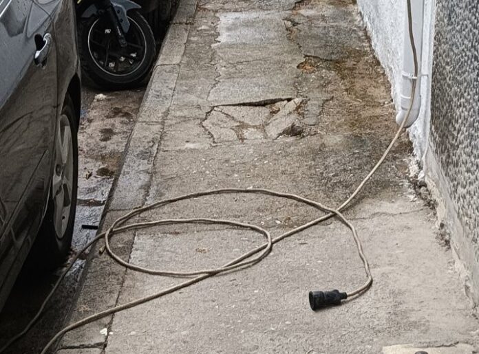 Μπροστά σε ένα καλώδιο αφημένο σε δημόσια θέα βρέθηκαν περαστικοί από την Τάκη Οικονομάκη. Ειδικότερα όσοι περπατούσαν στον συγκεκριμένο δρόμο είδαν μπροστά τους ένα καλώδιο με πρίζα παρατημένο πάνω στο πεζοδρόμιο και λίγο πιο δίπλα να υπάρχουν νερά, με ό,τι αυτό συνεπάγεται σε περίπτωση που υπήρχε ρεύμα. Τώρα πώς αφέθηκε πάνω στο πεζοδρόμιο εκτεθειμένο ένα καλώδιο είναι άξιο απορίας, αφού είναι κάτι πολύ επικίνδυνο για τους περαστικούς.