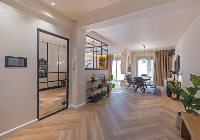 Το διαμέρισμα αυτό αποπνέει ζεστασιά και ισορροπία μέσα από μία λιτή αλλά προσεγμένη αισθητική. Το πλακάκι σε απομίμηση ξύλου «ντύνει» τον χώρο, χαρίζοντας οικειότητα και αρμονία, ενώ λειτουργεί ως κοινός συνδετικός κρίκος ανάμεσα στα επιμέρους δωμάτια.