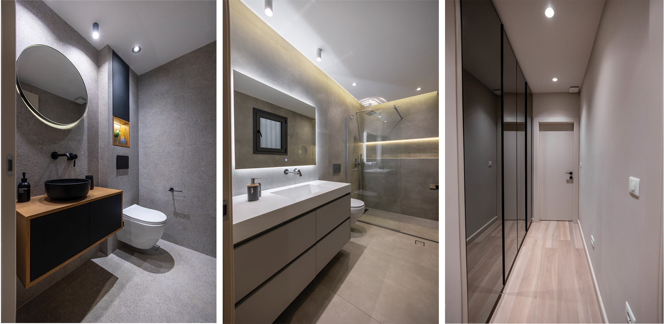 Στο κυρίως μπάνιο, τα πλακάκια σε αποχρώσεις τις άμμου και ο κρυφός φωτισμός, συνθέτουν έναν χώρο χαλάρωσης και ευεξίας. Αντίθετα, στο wc η επιλογή πλακιδίων τύπου πέτρας με έντονες μαύρες λεπτομέρειες προσθέτει δυναμισμό και μοντέρνα ένταση.