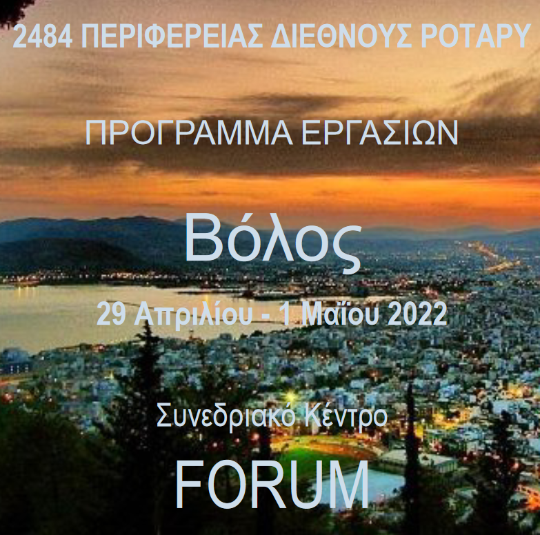 Ξεκινά σήμερα το 9ο Συνέδριο 2484 της Περιφέρειας Διεθνούς Ρόταρυ ” ΕΠΑΝΕΚΚΙΝΗΣΗ ” στην πόλη του Βόλου στο Συνεδριακό Κέντρο “Forum” στις 19.00 και το οποίο θα διαρκέσει μέχρι την Κυριακή, με τις πόρτες του ανοιχτές για το κοινό.