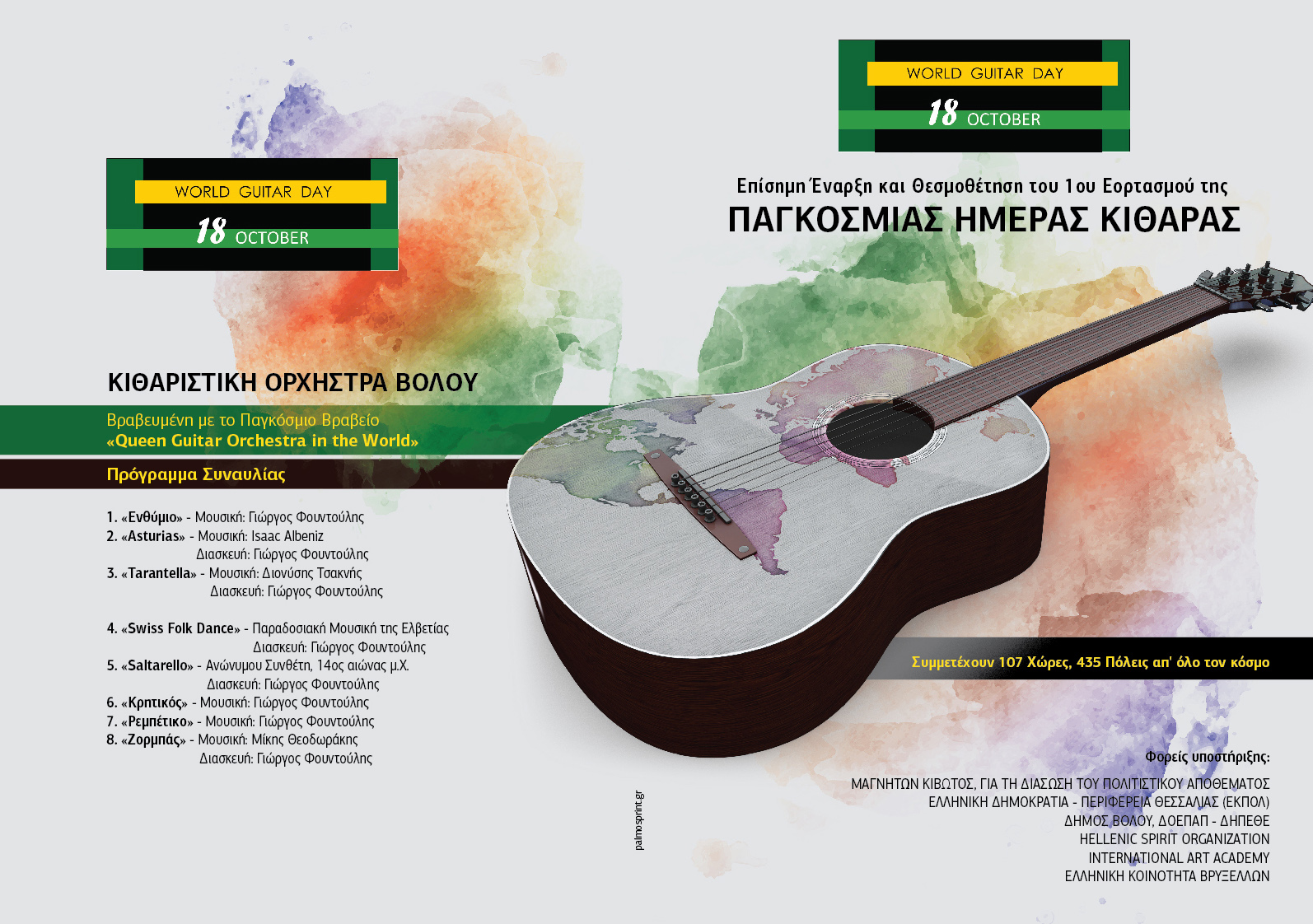 Ο 1ος Παγκόσμιος Εορτασμός και η επίσημη θεσμοθέτηση της Παγκόσμιας Ημέρας Κιθάρας θα πραγματοποιηθεί αύριο, Δευτέρα 18 Οκτωβρίου, στις 20.00, στο Συνεδριακό Κέντρο Θεσσαλίας της Ιεράς Μητροπόλεως Δημητριάδος & Αλμυρού, στα Μελισσάτικα Νέας Ιωνίας Βόλου, στην πόλη που ίδρυσε και συντονίζει τον Εορτασμό σε 107 Χώρες, σε 435 πόλεις από όλον τον κόσμο, όπως αναφέρεται σε σχετική ανακοίνωση.