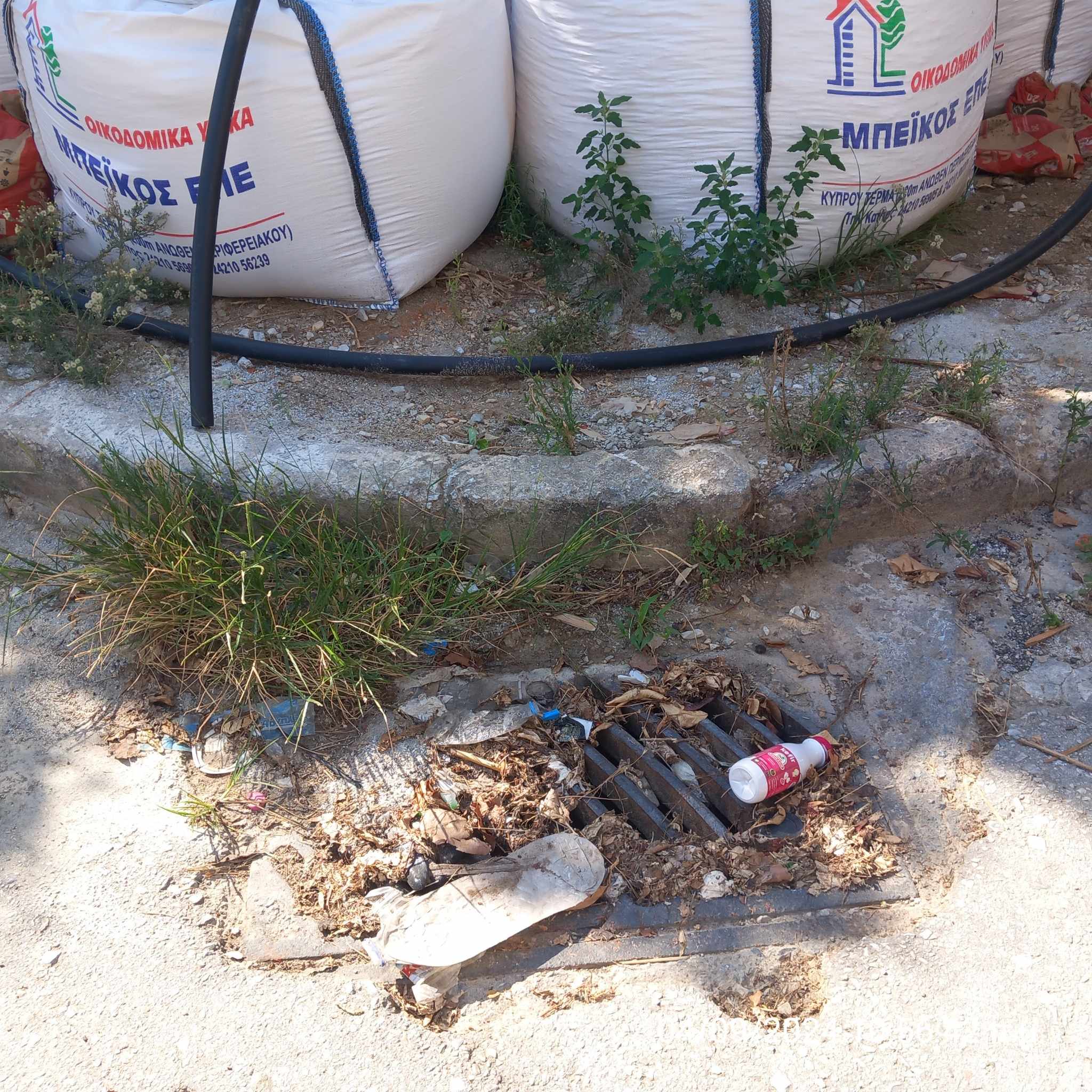 Η σχάρα του φρεατίου όμβριων έχει καλυφθεί εξ’ ολοκλήρου με σκουπίδια και άλλα φερτά υλικά και έχει κλείσει τελείως.