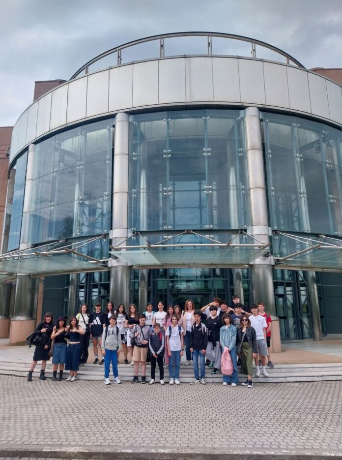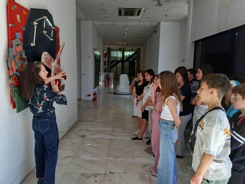 Οι μαθητές/ριες του Ομίλου Μουσικών Συνόλων και του Ομίλου Εικαστικών επισκέφτηκαν το Μέγαρο Μουσικής Θεσσαλονίκης. Η ξεναγός τους κ. Ανατολή Κοκκινίδου που τους περίμενε στο φουαγιέ όπου τους μίλησε για την ιστορία της ανέγερσης του κτιρίου και τον στόχο που τέθηκε να κατασκευαστεί ένα σύγχρονο, διεθνών προδιαγραφών πολιτιστικό και συνεδριακό κέντρο, το οποίο έχει τη δυνατότητα να φιλοξενεί ένα μεγάλο εύρος εκδηλώσεων από συναυλίες, παραστάσεις θεάτρου και όπερας, μπαλέτα, καλλιτεχνικές και πολιτιστικές εκθέσεις, μέχρι και συνεδριακές εκδηλώσεις. Στη συνέχεια περιηγήθηκαν στην κεντρική αίθουσα εκδηλώσεων (Αίθουσα Φίλων της Μουσικής), ανέβηκαν στην πολυμορφική κεντρική σκηνή της και επισκέφτηκαν τους βοηθητικούς χώρους πίσω και γύρω από τη σκηνή. Τέλος, βρέθηκαν σε ένα από τα μεγάλα καμαρίνια που διαθέτουν και πιάνο για να μελετούν οι σολίστες πριν από το ρεσιτάλ τους. Σ’ αυτό το πιάνο που έχει χρησιμοποιηθεί από διάσημους βιρτουόζους της διεθνούς μουσικής σκηνής τα παιδιά έπαιξαν και τραγούδησαν μουσική του Μάνου Χατζιδάκι. Ο Όμιλος Εικαστικών προγραμμάτισε ξενάγηση στο Μουσείο Σύγχρονης Τέχνης ‘’MOMUS’’, στην οποία συμμετείχαν όλοι οι όμιλοι και είχαν την ευκαιρία να βιώσουν μια πολυαισθητηριακή εμπειρία τέχνης μέσα από επιτοίχια έργα, εγκαταστάσεις, βίντεο αρτ, που ανήκουν στην μόνιμη και την περιοδική συλλογή του Μουσείου. Σε κάθε επίπεδο του εκθεσιακού χώρου εξελίσσεται μια διαφορετική αφηγηματική ενότητα που αναδεικνύει τη σχέση του δωρητή (Ιόλα) με διάσημους καλλιτέχνες, από τον Victor Brauner στον Κώστα Τσόκλη, από τον Αλέξη Ακριθάκη στον Γιώργο Λαζόγκα και τον Παύλο, από την Niki de Phalle στον Jean Tinguely, από τον Dennis Oppenheim στον Andy Warhol, από τον Elisseo Μattiaci στον Pino Pascali, από τον Νovello Finotti στον Herbert List και τον Τάκι. Στον χώρο περιοδικών εκθέσεων του Μουσείου, παρουσιάζονται τα νέα έργα που προέκυψαν από το φετινό καλλιτεχνικό εργαστήριο κατά το οποίο 20 εικαστικοί εργάστηκαν με τον επικεφαλής, προσκεκλημένο εικαστικό Νίκο Χαραλαμπίδη, πάνω στην έννοια της Επιστροφής, ως έννοια που ξεκινάει μεν από την επέτειο των 50 χρόνων από την τουρκική εισβολή στην Κύπρο το 1974, ωστόσο επεκτείνεται στο διαγενεακό τραύμα του «νόστου», της χαμένης πατρίδας και του χαμένου σπιτιού, της βίαιης εκτόπισης και μετανάστευσης, αλλά και στη μελλοντολογική φαντασία γύρω από αυτό που έχει χαθεί, αλλά διαρκώς αναζητείται.