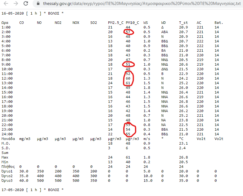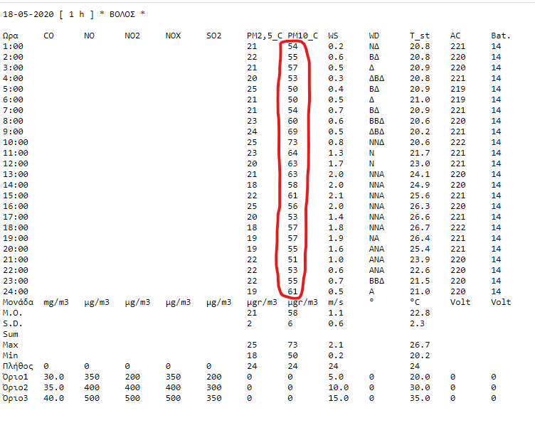 18-05-20: 24 ώρες/24ωρο στα ΡΜ10! Η Περιφέρεια παραδέχεται μ.ο. για τις 18-05-20, 58>50 όριο. Κι όμως μιλάει για “καθαρή ατμόσφαιρα”. Δηλαδή στις 18-05-20 είχαμε όλη μέρα υπερβάσεις αλλά όλα καλά! Αιδώς αχρείοι!