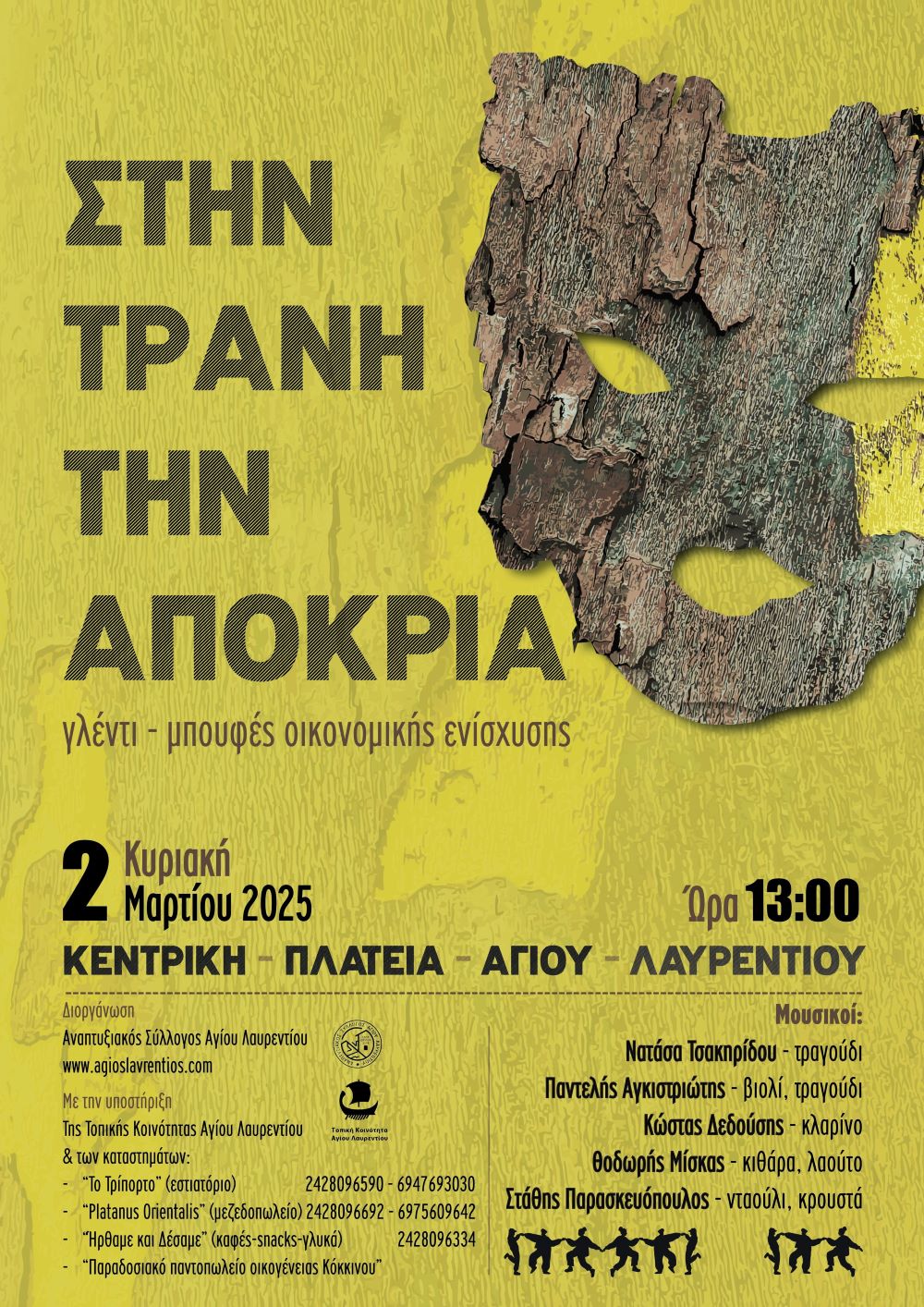 Ο «Αναπτυξιακός Σύλλογος Αγίου Λαυρεντίου», οι κάτοικοι του χωριού και το μεγαλύτερο μέρος των επαγγελματιών της κεντρικής πλατείας διοργανώνουν από κοινού τη γιορτή της τελευταίας Κυριακής της Αποκριάς -την λεγόμενη και «Τρανή Αποκριά»- στις 2 Μαρτίου, με ώρα έναρξης 13.00, στην κεντρική πλατεία του Αγίου Λαυρεντίου.