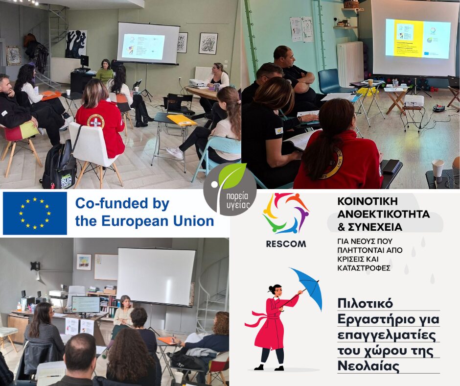 Με μεγάλη επιτυχία πραγματοποιούνται οι εκδηλώσεις διάχυσης του έργου RESCOM Κοινοτική Ανθεκτικότητα και Συνέχεια για Νέους που πλήττονται από Κρίσεις και Καταστροφές, από την Πορεία Υγείας Κοιν.Σ.Επ. Το έργο απευθύνεται σε ψυχολόγους, κοινωνικούς λειτουργούς, εκπαιδευτικούς, και άλλους επαγγελματίες ή εθελοντές που υποστηρίζουν ή μπορεί να υποστηρίξουν νέους σε κρίση και συγχρηματοδοτείται από την ΕΕ. Πρόκειται για έργο με ουσιαστικό αντίκτυπο, αφού στο πλαίσιό του παράγεται επιμορφωτικό υλικό για την υποστήριξη νέων που ζουν τις επιπτώσεις του συλλογικού τραύματος, είτε λόγω ανθρωπογενών ατυχημάτων είτε λόγω καιρικών φαινομένων, όπως αυτά που συμβαίνουν στην περιοχή μας.