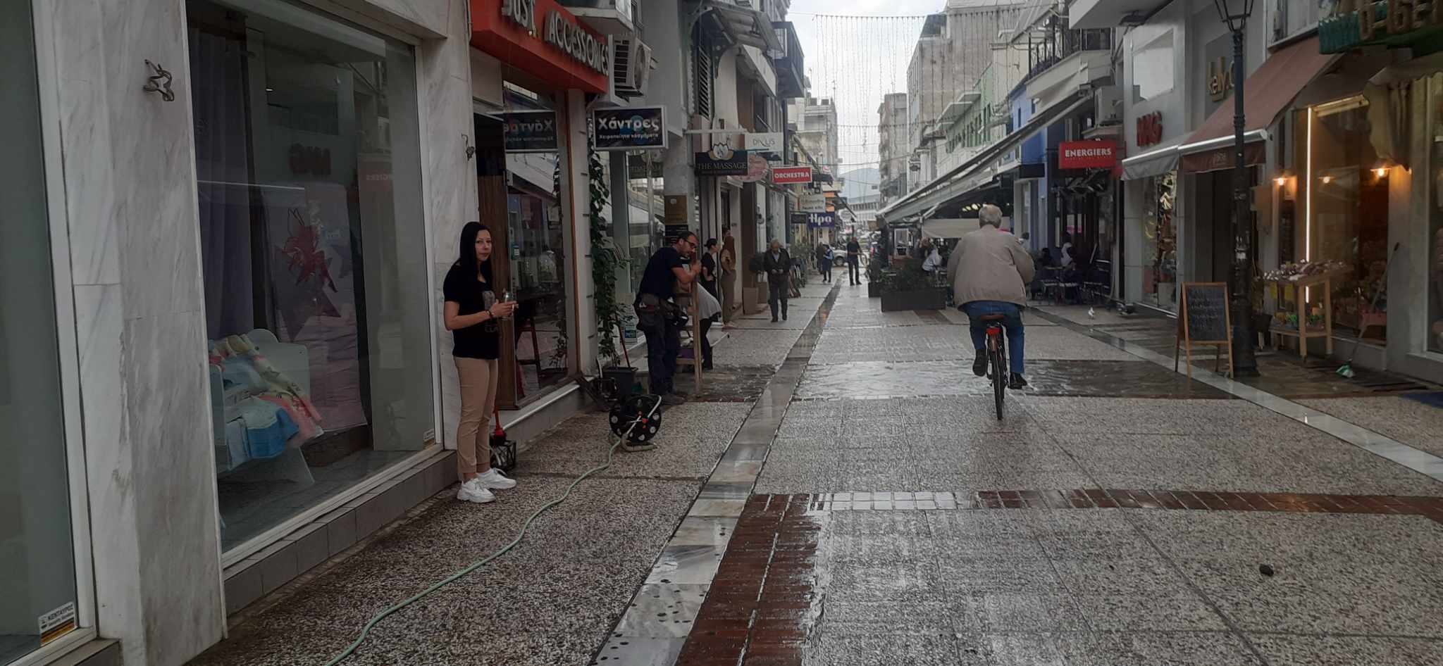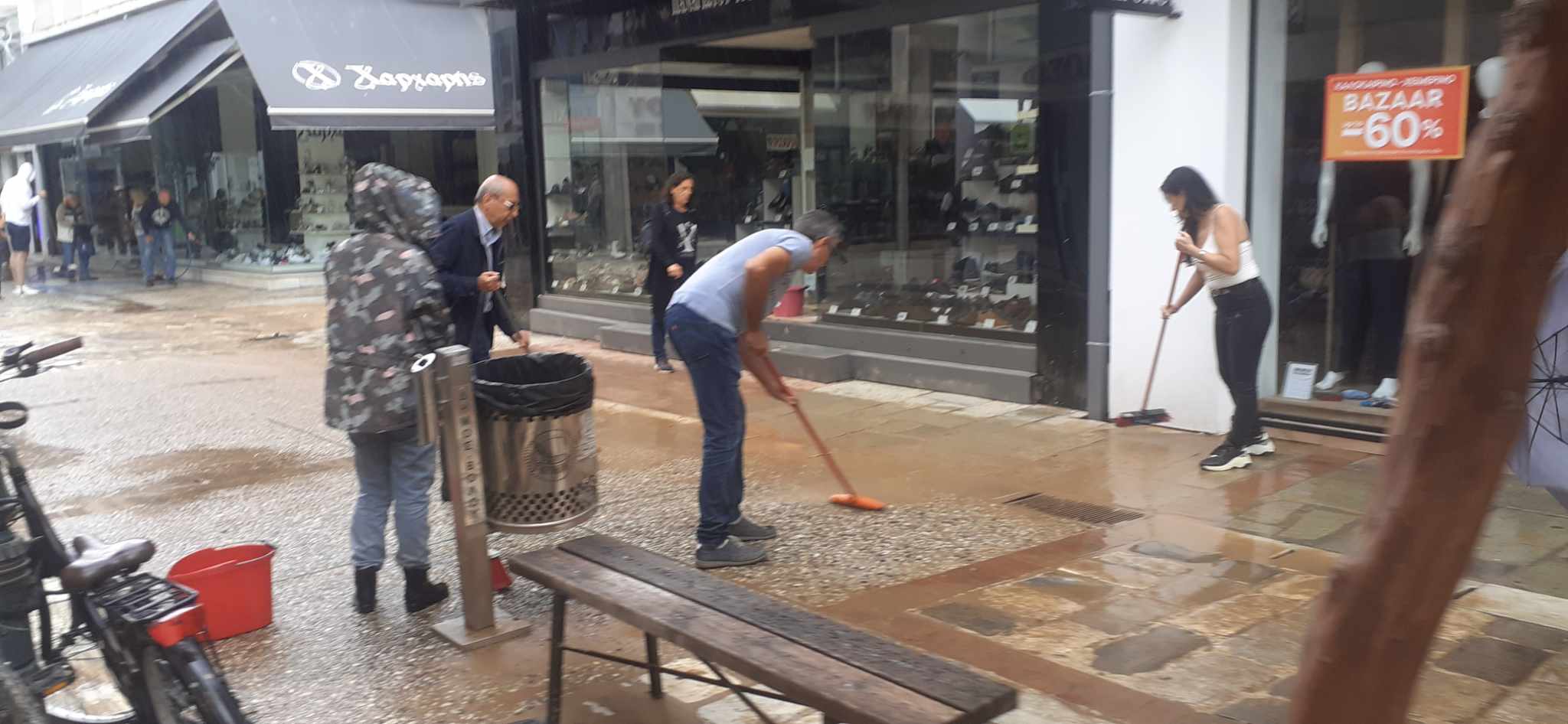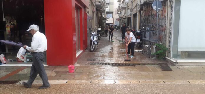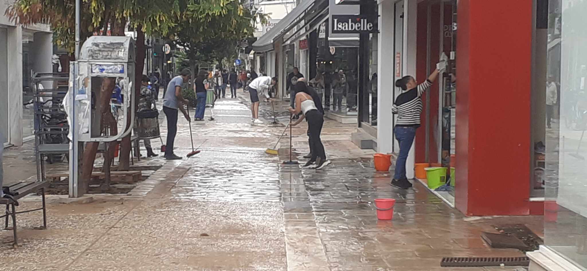 Στον δρόμο έχουν βγει από σήμερα το πρωί οι έμποροι του Βόλου με σκούπες, φαράσια και λάστιχα να προσπαθήσουν να καθαρίσουν τα καταστήματά τους από τις λάσπες. Σε κάθε γωνιά έμποροι και εργαζόμενοι μαζεύουν τα εμπορεύματά τους, καθώς πολλά από αυτά αχρηστεύτηκαν και καθαρίζουν και πεζοδρόμια, δρόμους και πεζοδρόμους.