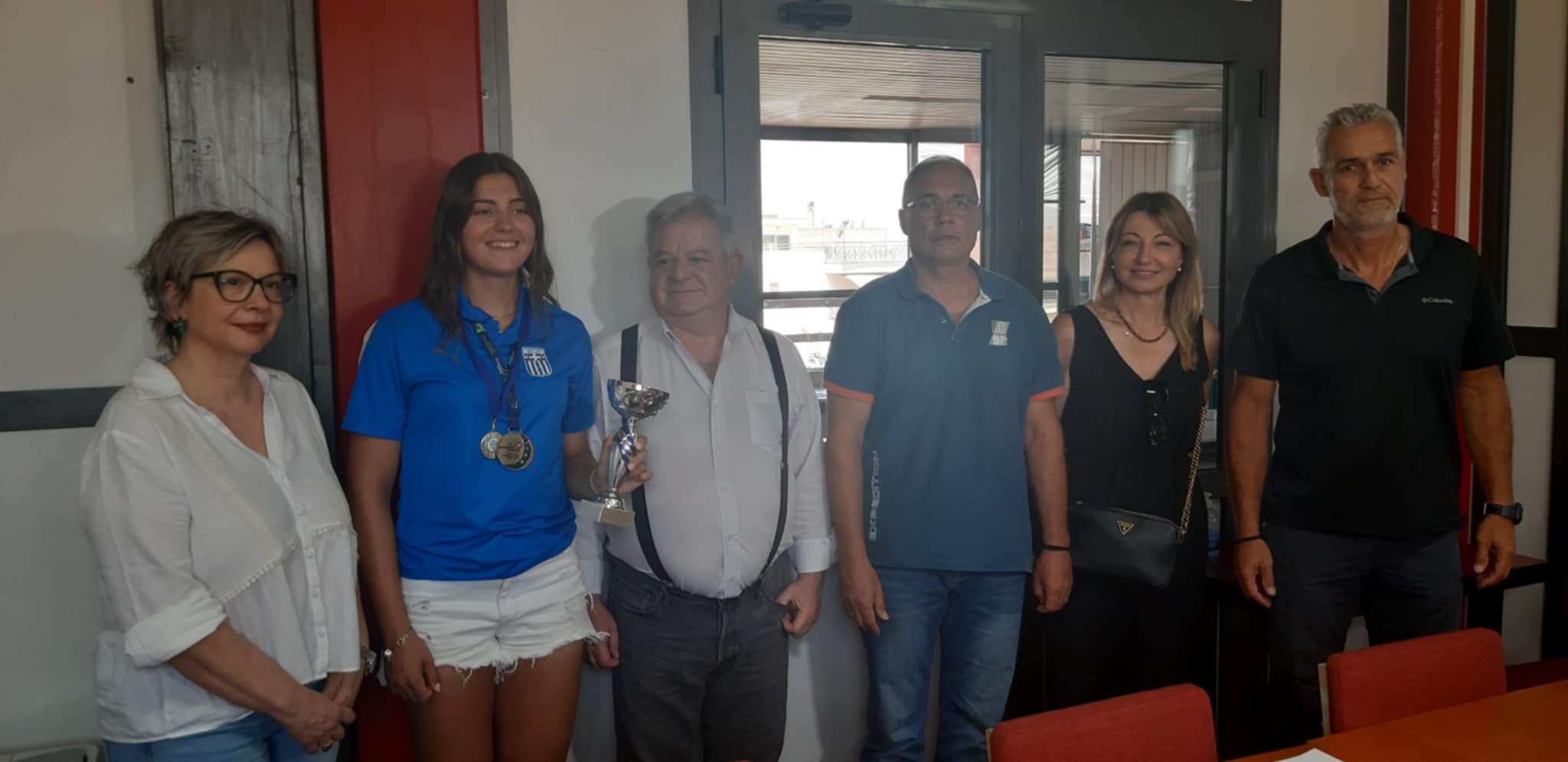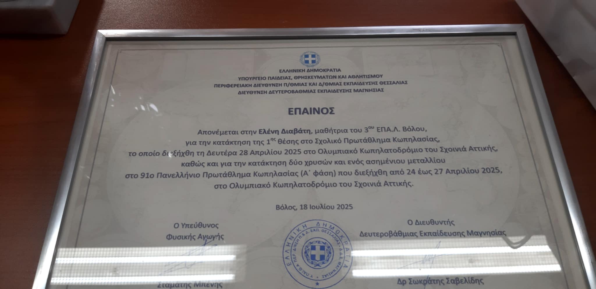 Σήμερα, η 17χρονη Έλενα βρέθηκε στη Διεύθυνση Δευτεροβάθμιας Εκπαίδευσης Μαγνησίας, όπου ο Διευθυντής κ. Σωκράτης Σαβελίδης της έδωσε τιμητικό έπαινο για τις διακρίσεις της. Εκτός από το χρυσό στο Πανευρωπαϊκό Πρωτάθλημα εφήβων νεανίδων στο διπλό σκιφ, η Έλενα αυτή τη χρονιά κατέκτησε την 1η θέση στο Σχολικό Πρωτάθλημα Κωπηλασίας, δύο χρυσά και ένα ασημένιο μετάλλιο στο 91ο Πανελλήνιο Πρωτάθλημα Κωπηλασίας (α φάση).