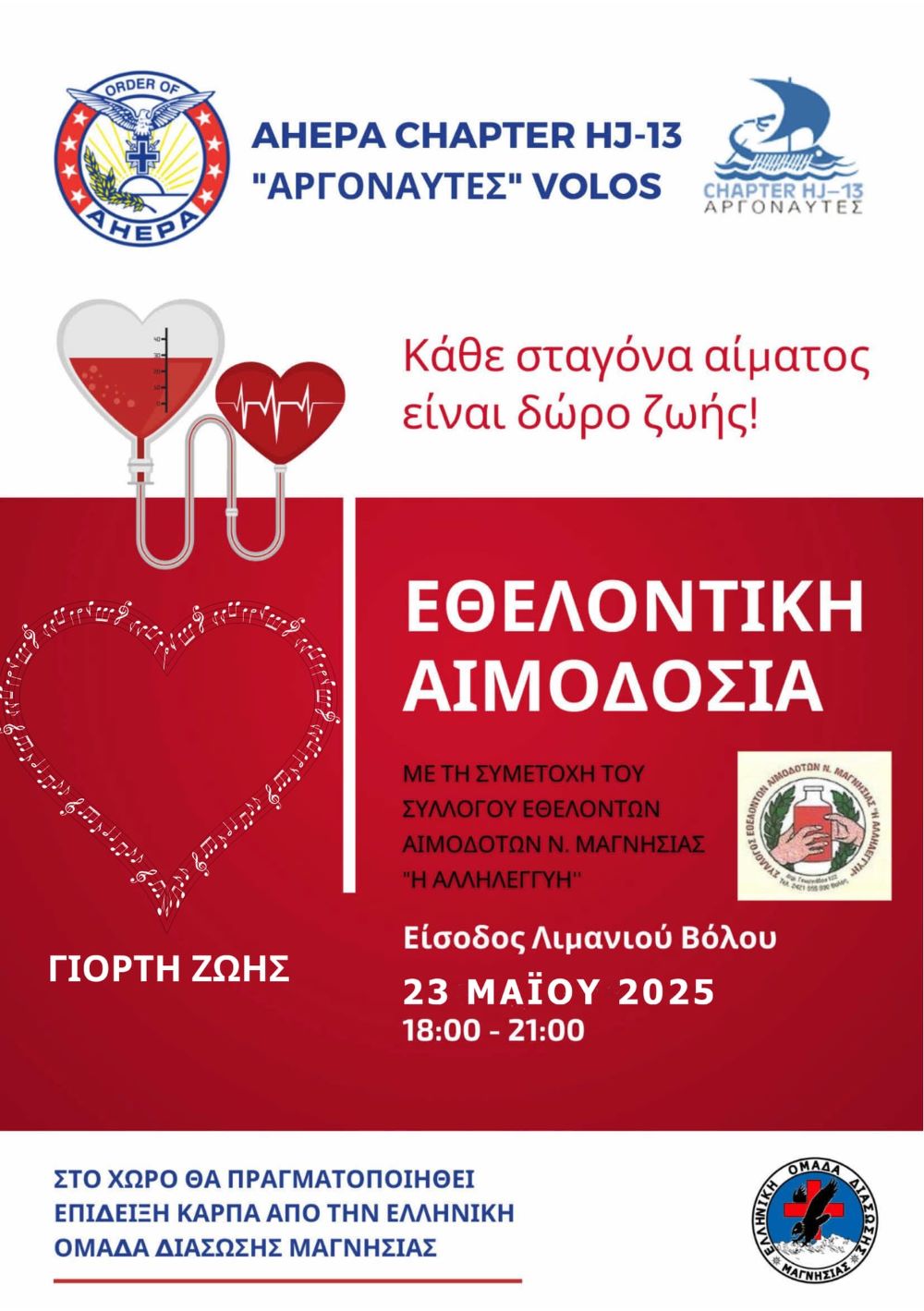 Εθελοντική αιμοδοσία θα πραγματοποιήσουν αύριο Παρασκευή 23 Μαΐου τα μέλη του τμήματος ahepa hj13-argonauts volos και του συλλόγου εθελοντών αιμοδοτών «Αλληλεγγύη».