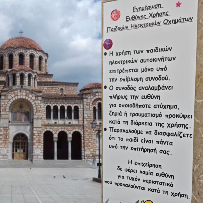 Σύμφωνα με την επιγραφή που έχει αναρτηθεί σε εμφανές σημείο, η χρήση των παιδικών ηλεκτρικών αυτοκινήτων επιτρέπεται μόνο υπό την επίβλεψη συνοδού. Ο συνοδός αναλαμβάνει πλήρως την ευθύνη για οποιοδήποτε ατύχημα, ζημιά ή τραυματισμό προκύψει κατά τη διάρκεια της χρήσης. Έτσι παρακαλούν τους γονείς ή όσους έχουν την επίβλεψη του παιδιού να διασφαλίζουν ότι το παιδί είναι πάντα υπό την επιτήρησή τους.