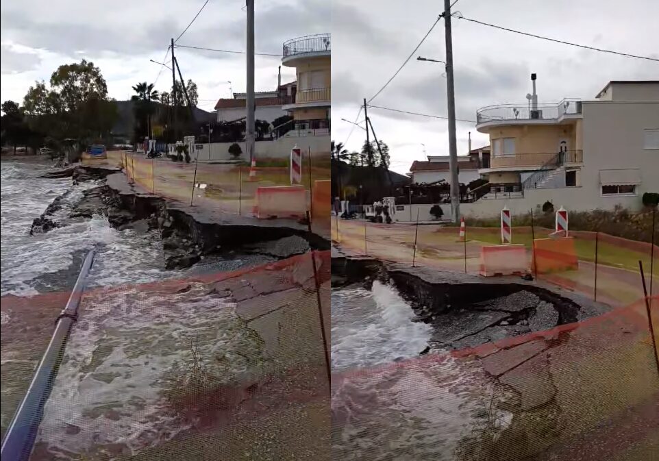 «Φαγώθηκε» ο δρόμος στις Αλυκές! Η θάλασσα σκέπασε το κατεστραμμένο οδόστρωμα