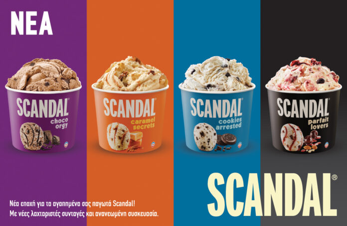 Ανανεωμένο λαχταριστό παγωτό με γεύση καραμέλα, σιρόπι καραμέλας και καραμελωμένα πεκάν, πλούσιο παγωτό με γεύση σοκολάτα, σιρόπι κακάο και κομμάτια σοκολάτας, απολαυστικό παγωτό με γεύση βανίλια και τραγανά κομματάκια μπισκότων και λαχταριστό παγωτό με γεύση βανίλια, σιρόπι κεράσι με κομμάτια κερασιού και κομμάτια αμυγδάλου συνθέτουν τις πιο SCANDAL απολαυστικές γευστικές εμπειρίες!