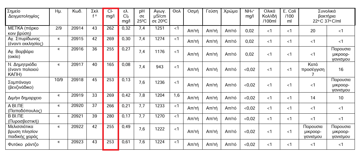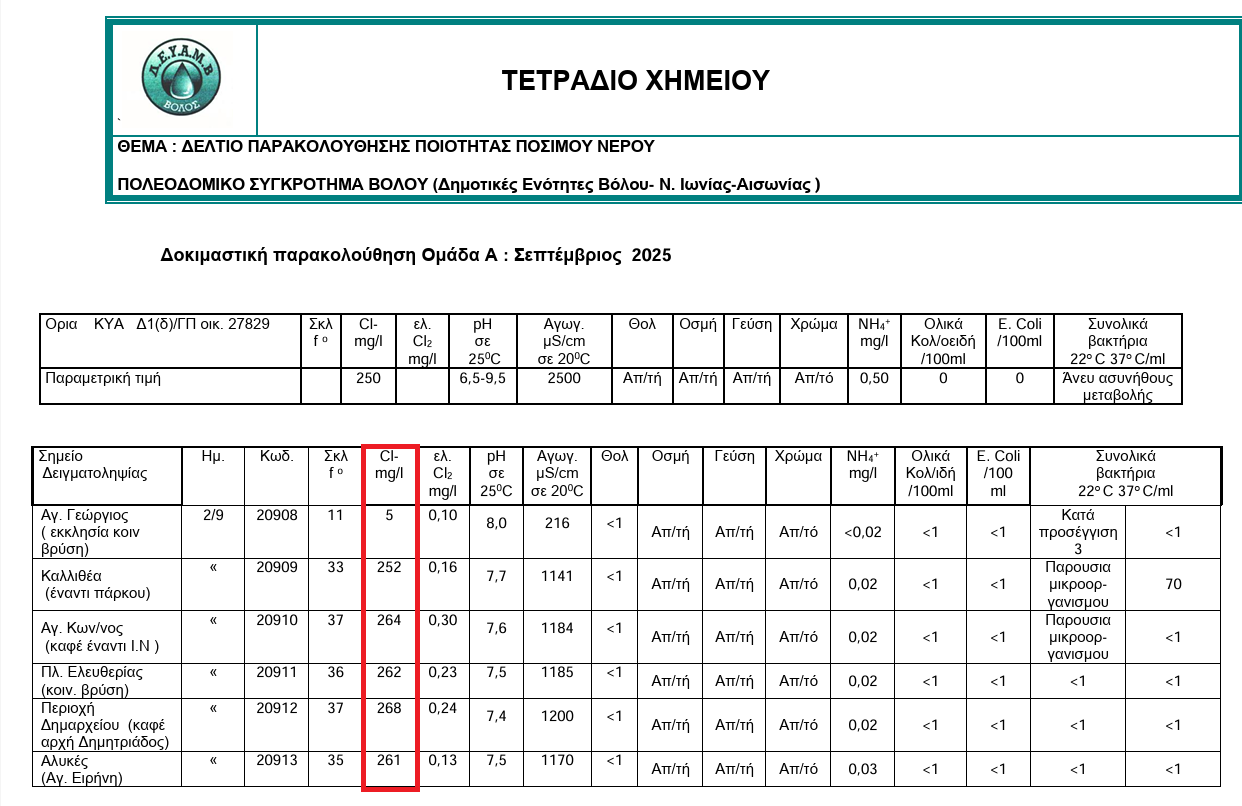 Ειδικότερα, στην περιοχή της ΜΕΤΚΑ τα χλωριόντα είναι 262mg/l, στον Άγιο Σπυρίδωνα 269, στην Αγία Βαρβάδα 255, στον Σαμπάναγα 253, στο Διμήνι 269, στην Α ΒΙΠΕ 266, στη Β ΒΙΠΕ 280, στα Μελισσιάτικα 255, το Φυτόκο 253, στην Καλλιθέα 252, στον Άγιο Κωνσταντίνο 264, στην Πλατεία Ελευθερίας στην κοινόχρηστη βρύση 262, στην περιοχή του Δημαρχείου (καφέ αρχή Δημητριάδος) 268 και 261 στις Αλυκές και ειδικότερα στην περιοχή της Αγίας Ειρήνης.