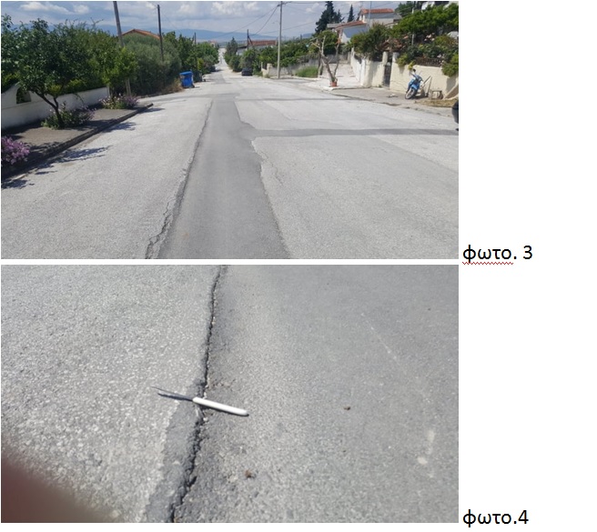 2) Σε πολλά τμήματα του έργου όπου οι τομές έχουν ήδη ασφαλτοστρωθεί παρουσιάζονται πρόωρες τοπικές καθιζήσεις. Ως τελικό αποτέλεσμα η ραφή της τομής δεν έχει ισοϋψή συναρμογή με το υπόλοιπο τμήμα της οδού (ενδεικτικά φωτο.3, φωτο.4), ενώ κατά μήκος της αποκατεστημένης τομής η επιφάνεια της ασφάλτου παρουσιάζει μικρές παραμορφώσεις. Οφείλουμε να επισημάνουμε το γεγονός ότι τα περιγραφόμενα τμήματα οδού έχουν δοθεί στην κυκλοφορία και καθιστούν επικίνδυνη τη διέλευση των τροχοφόρων, ιδιαίτερα των δίκυκλων και ποδηλάτων, ενώ με την πάροδο του χρόνου θα κατακρατούν νερό που δεν αποτελεί μόνο αιτία καταστροφής του οδοστρώματος αλλά προκαλούν ολισθηρότητα αυξάνοντας το δείκτη επικινδυνότητας για όλα τα τροχοφόρα.