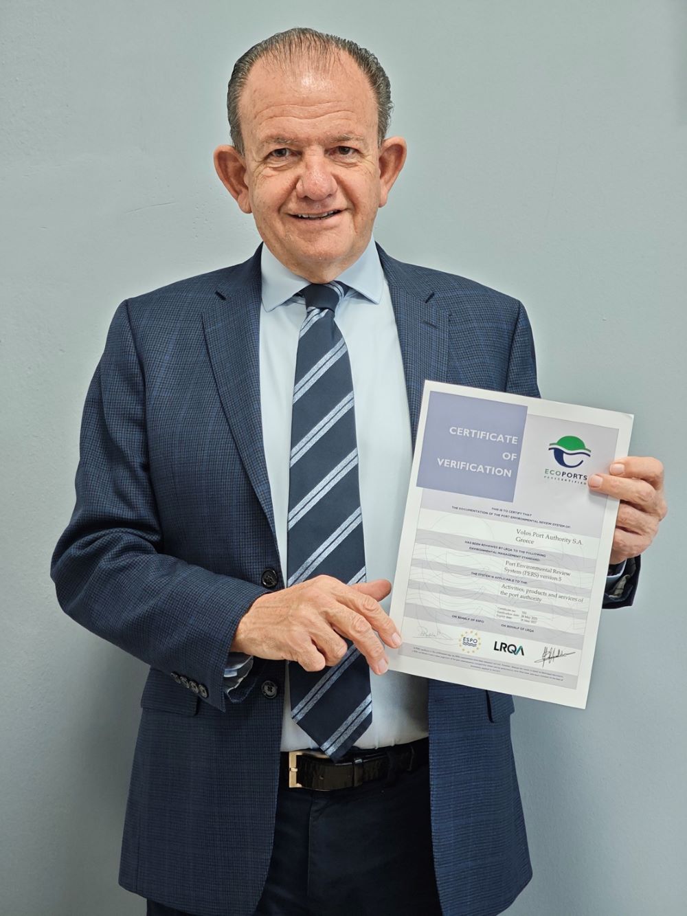 Ο Οργανισμός Λιμένος Βόλου ανανέωσε για τέταρτη φορά την πιστοποίηση Port Environmental Review System (PERS) από τον Ευρωπαϊκό Οργανισμό Θαλάσσιων Λιμένων (ESPO), ένα εξέχον περιβαλλοντικό πρότυπο στον ευρωπαϊκό λιμενικό τομέα.