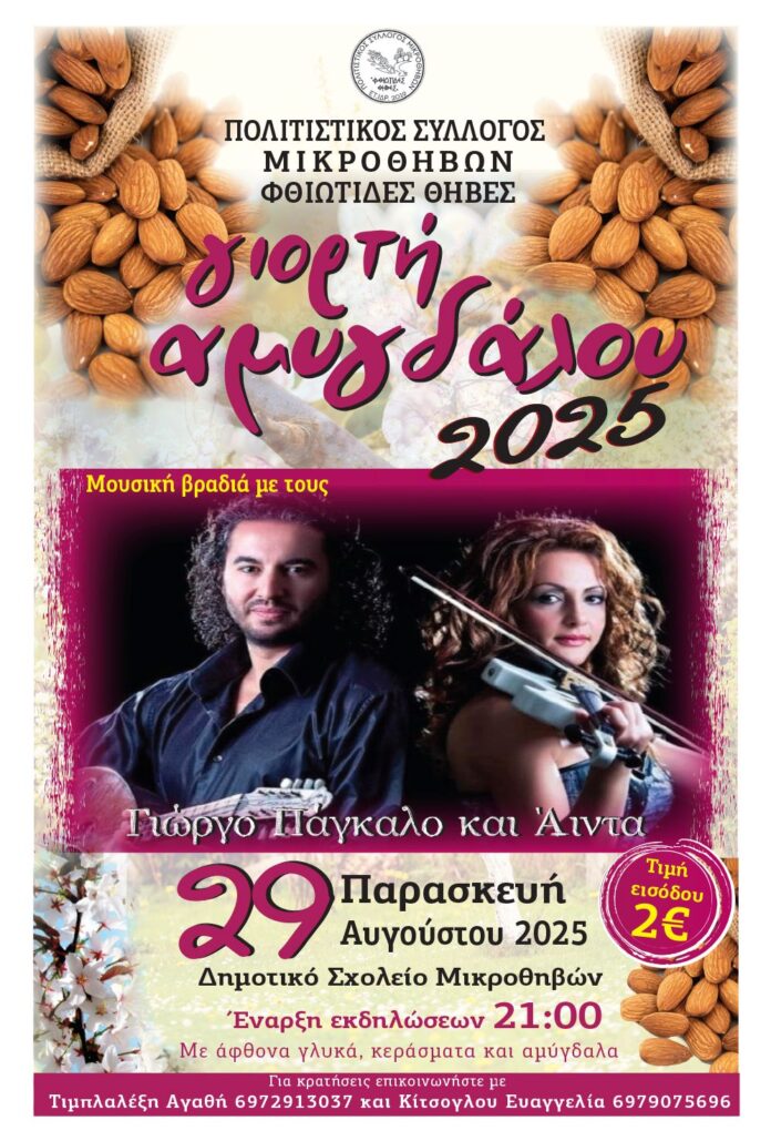 Ο Πολιτιστικός Σύλλογος Μικροθηβών Φθιώτιδες Θήβες, στο πλαίσιο των προγραμματισμένων πολιτιστικών εκδηλώσεών του για το τρέχον έτος, διοργανώνει την «Γιορτή Αμυγδάλου 2025» την Παρασκευή 29 Αυγούστου 2025 και ώρα 9.00 μ.μ. στην έδρα του Συλλόγου (πρώην Δημ. Σχολείο Μικροθηβών).