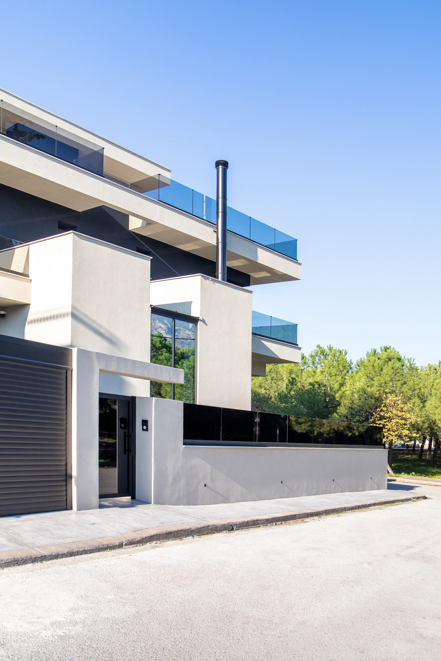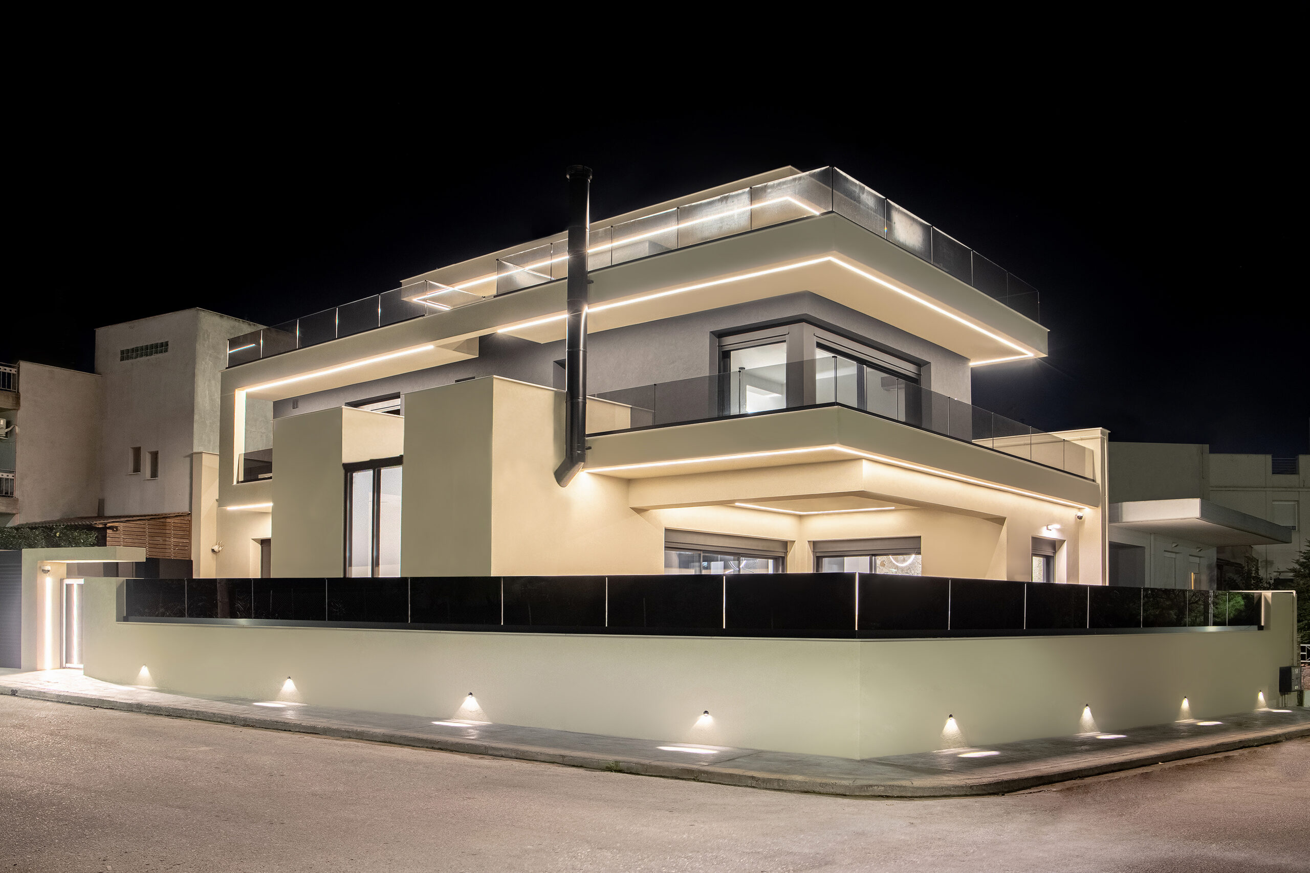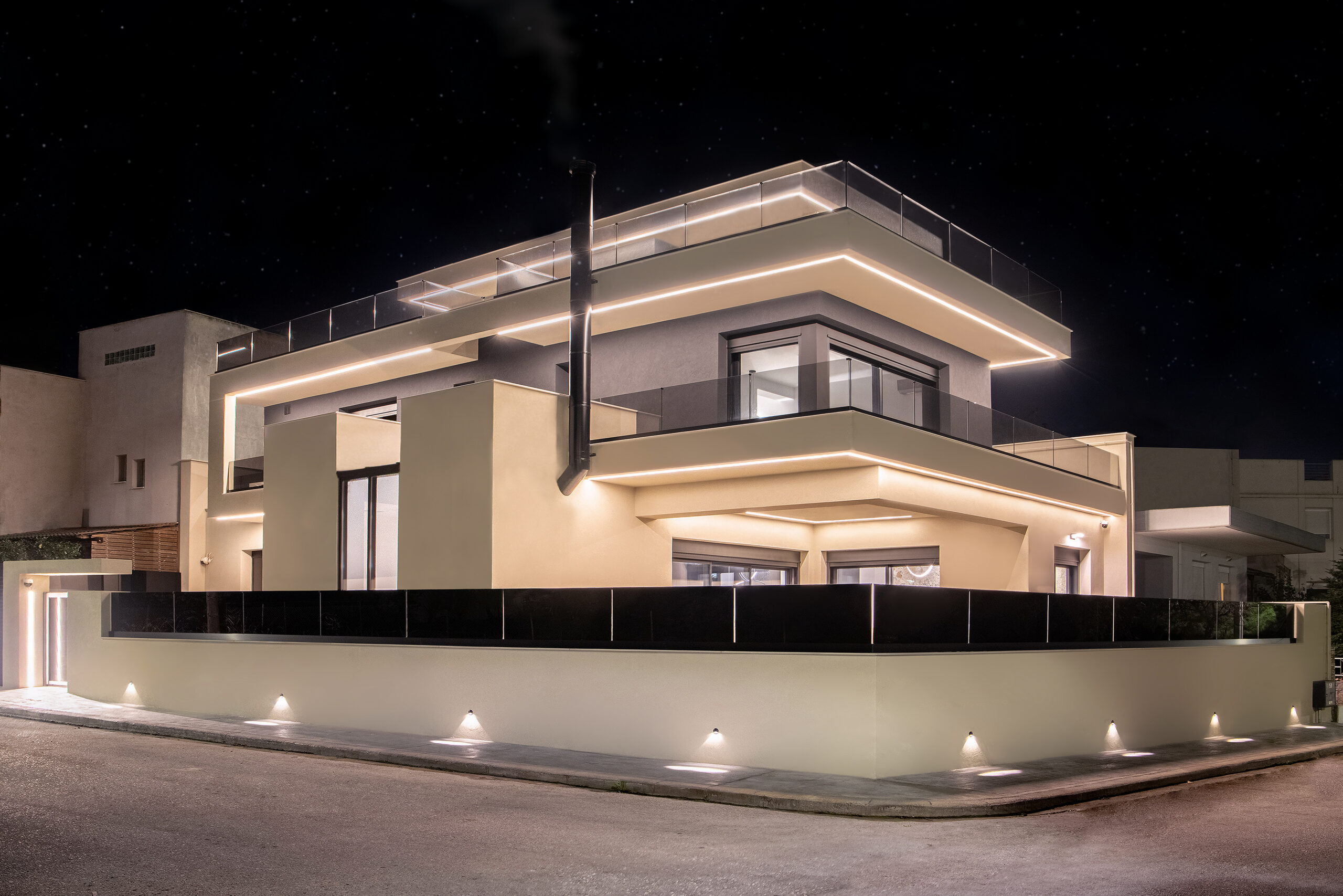 Αυτό επιτυγχάνεται χάρη στον βαθύ πρόβολο και στη γραμμική φωτεινή αντανάκλαση που περιγράφει το περίγραμμα του όγκου. Οι σκουρόχρωμες λεπτομέρειες – κουφώματα από ανθρακονήματα και διαφανή προστατευτικά κιγκλιδώματα – λειτουργούν ως οπτικά «κοψίματα» που ενισχύουν τη μινιμαλιστική γεωμετρία.