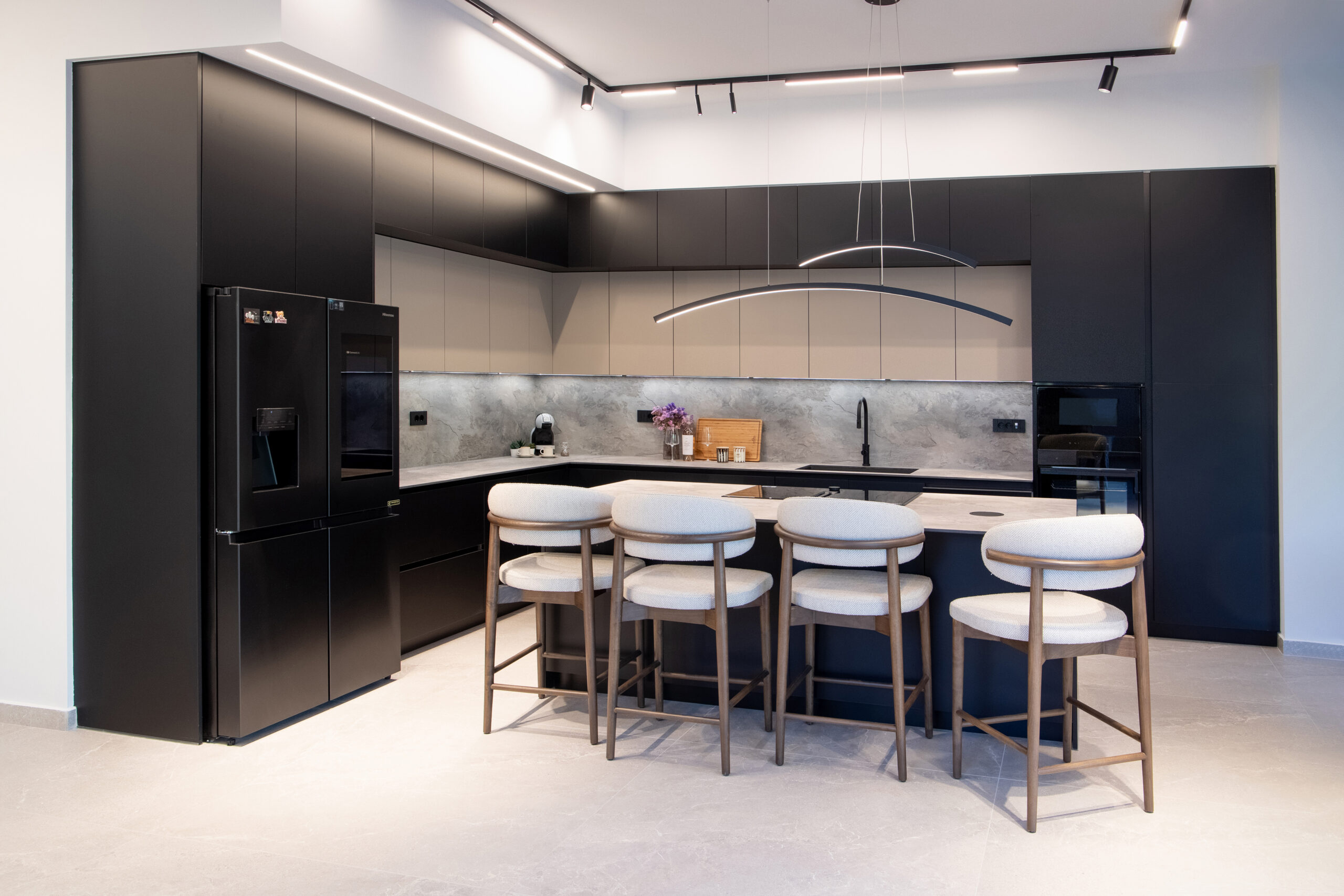 Η κουζίνα σχεδιάστηκε σε μορφή L, με κεντρική νησίδα που φιλοξενεί τις εστίες και απορροφητήρα δαπέδου, ώστε να διατηρείται ανεμπόδιστη η οπτική προς το καθιστικό. Κατασκευάστηκε από υλικά υψηλής αντοχής σε υγρασία και φθορά, με έμφαση στη καθαρή αισθητική.
