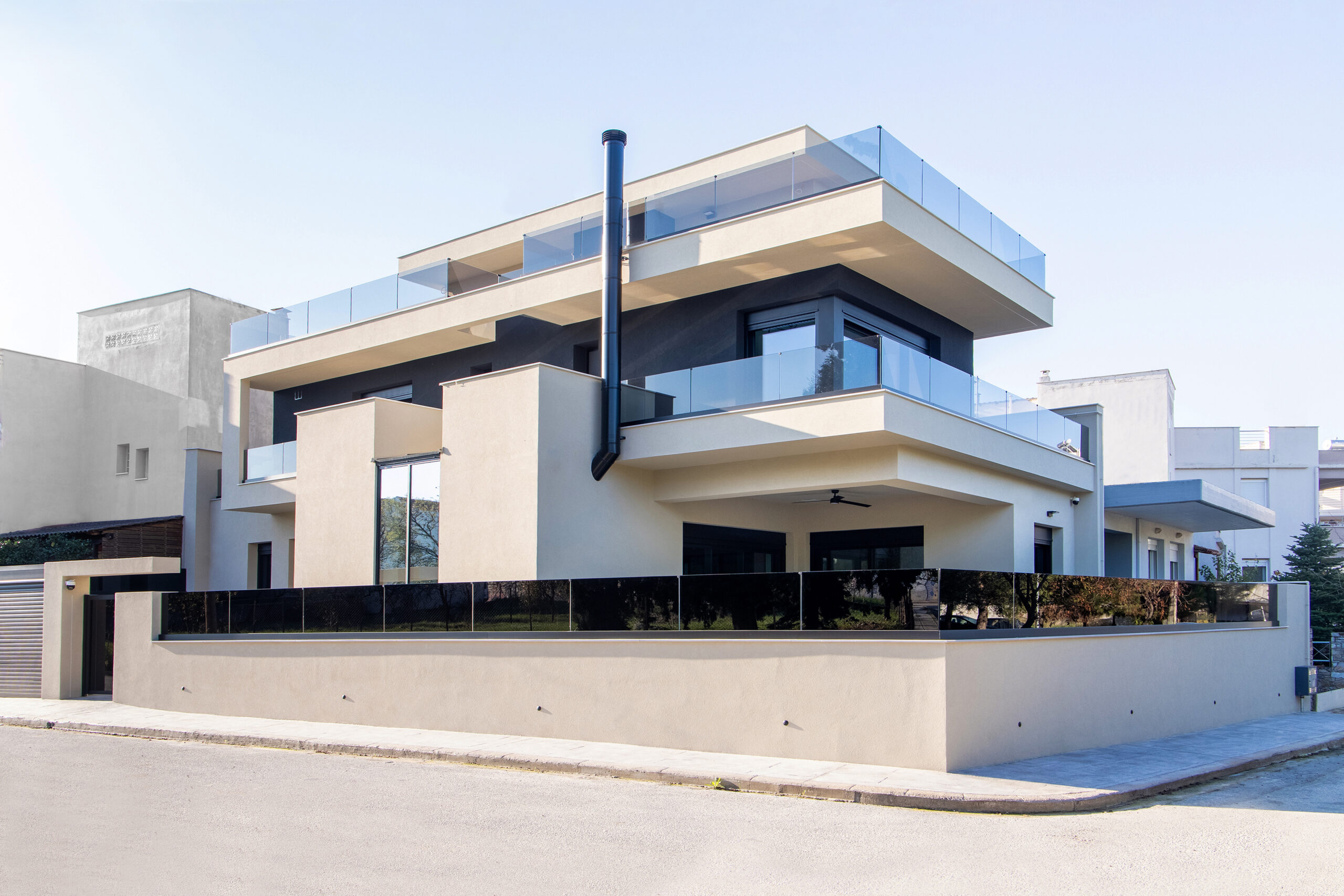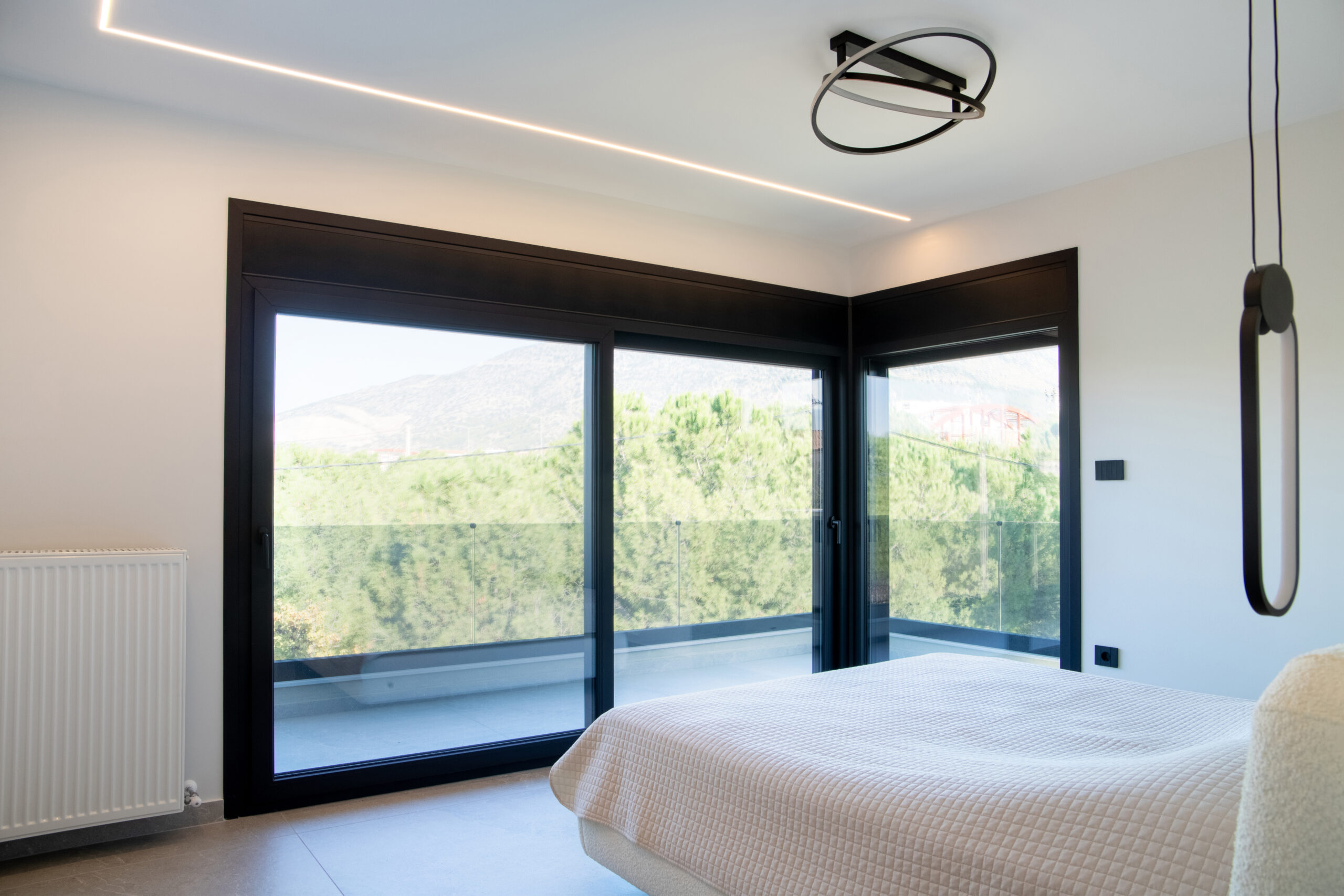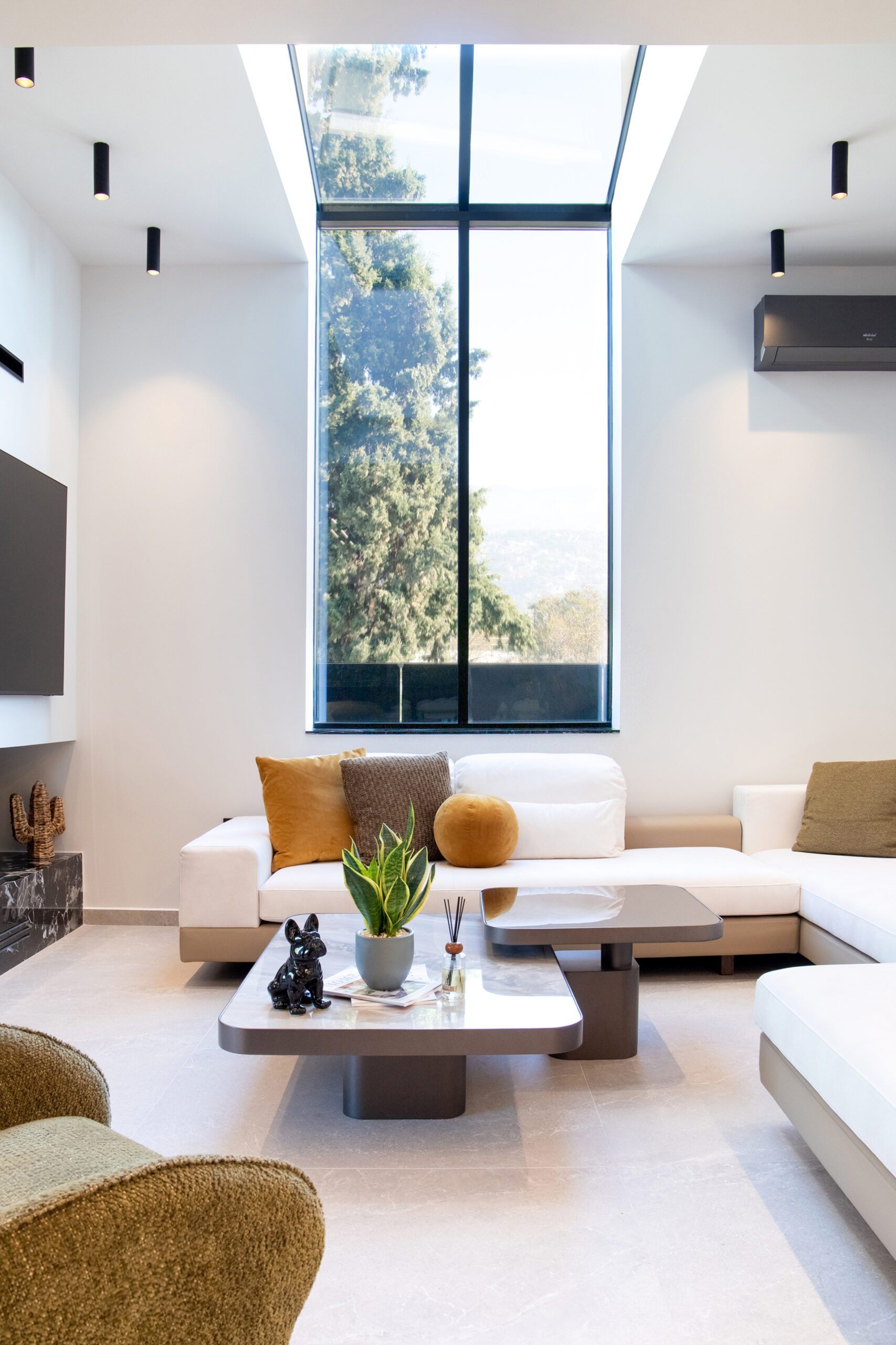 Παράλληλα, το γωνιακό παράθυρο του ισογείου – μια καθαρή, διαφανής γωνία που καταργεί το κατακόρυφο στοιχείο και ανοίγει το βλέμμα απευθείας προς τον ουρανό – αποτέλεσε εξίσου απαιτητική λύση. Η αφαίρεση του δοκαριού στην ακμή διαφοροποίησε τον τρόπο λειτουργίας του φέροντος οργανισμού, ενώ απαιτήθηκαν customυαλοπετάσματα ικανά να παραλάβουν ανεμοπιέσεις και να εξασφαλίσουν την ακαμψία σε ένα τόσο μεγάλο, «ελεύθερο» άνοιγμα. Το αποτέλεσμα δικαιώνει την κατασκευαστική προσπάθεια: ένα καθαρό γυάλινο πλαίσιο που επιτρέπει στο φως να εισβάλλει κάθετα στον χώρο, δημιουργώντας μια μοναδική οπτική σύνδεση με τον ουρανό.