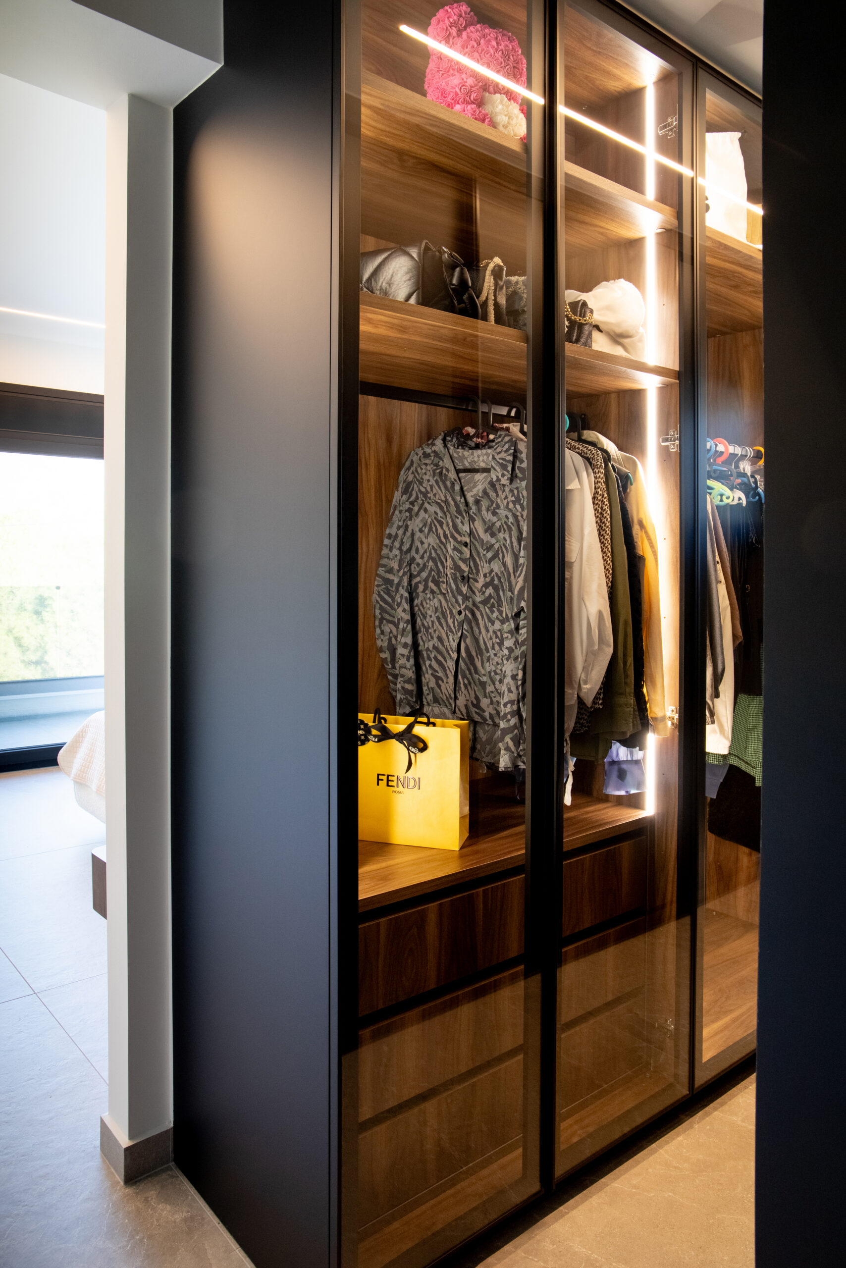 Η επιλογή πολυμερικών υλικών για τις εσωτερικές πόρτες και τις ντουλάπες αντικαθιστά τις παραδοσιακές βαμμένες ξύλινες επιφάνειες. Το αποτέλεσμα είναι ομοιόμορφο φινίρισμα, αντοχή στον χρόνο και ελάχιστη συντήρηση – χαρακτηριστικά που συνάδουν με τη συνολική αρχιτεκτονική επιμέλεια και τον σύγχρονο τρόπο ζωής.